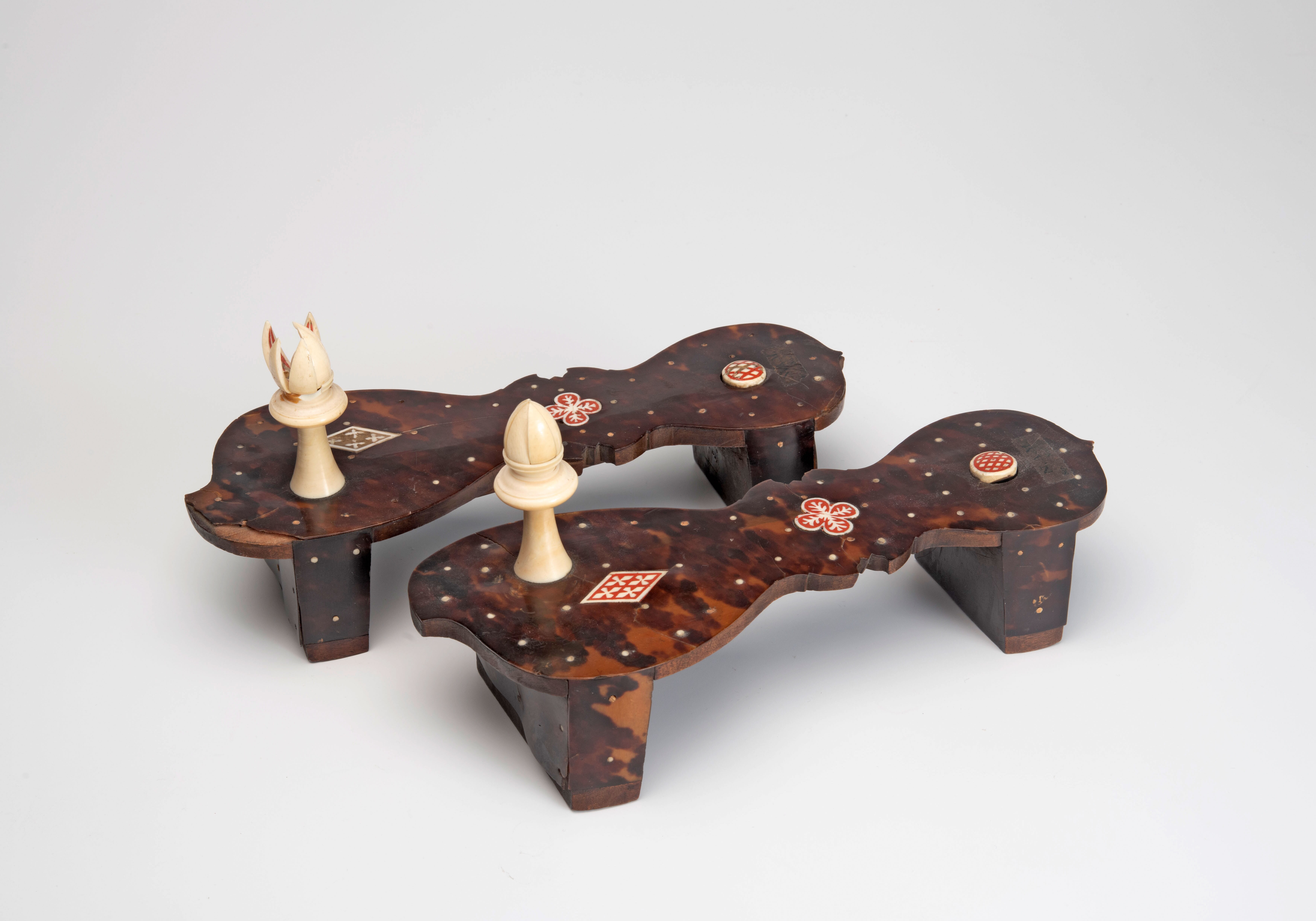 Paar houten voetklossen belegd met schildpad en met ...