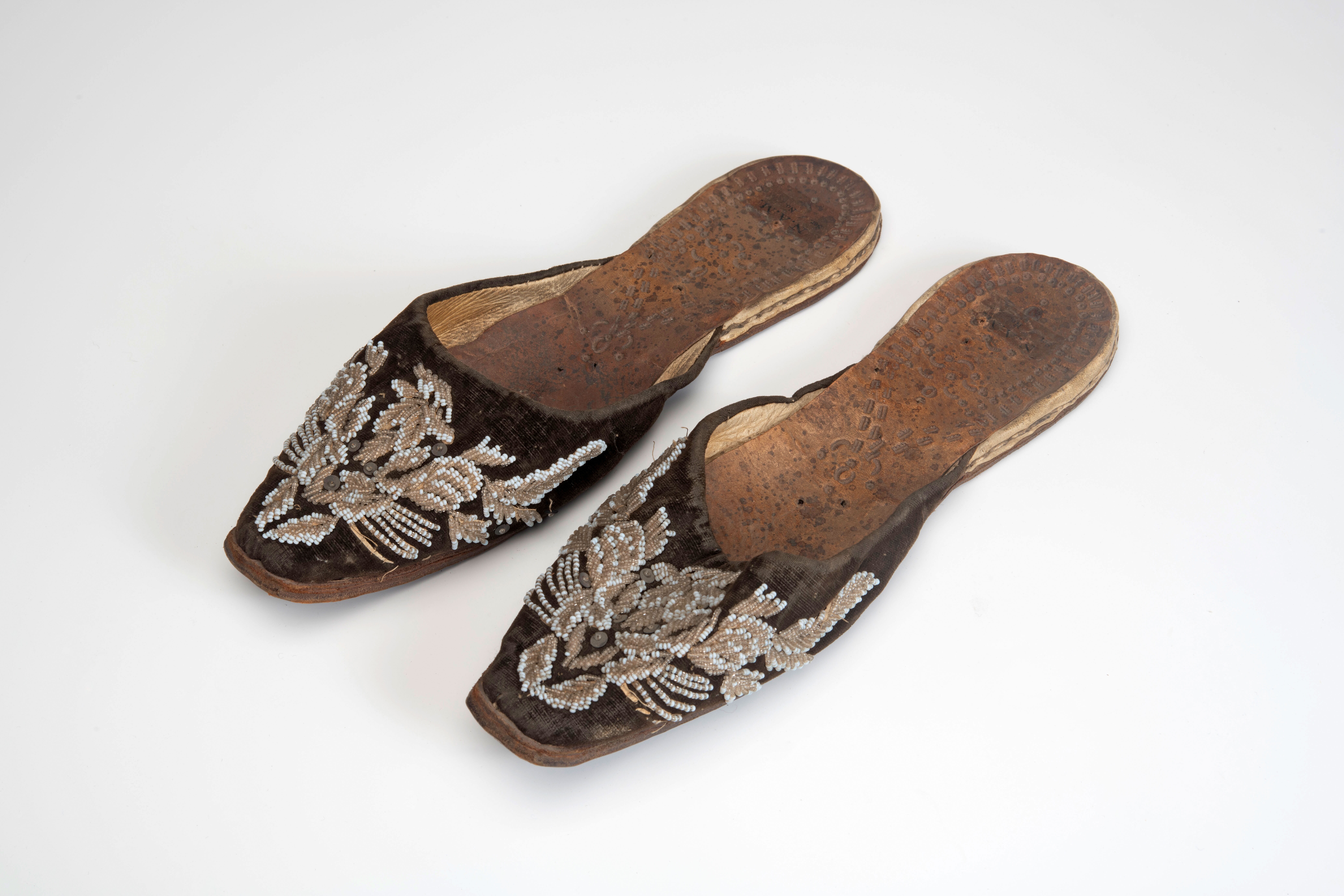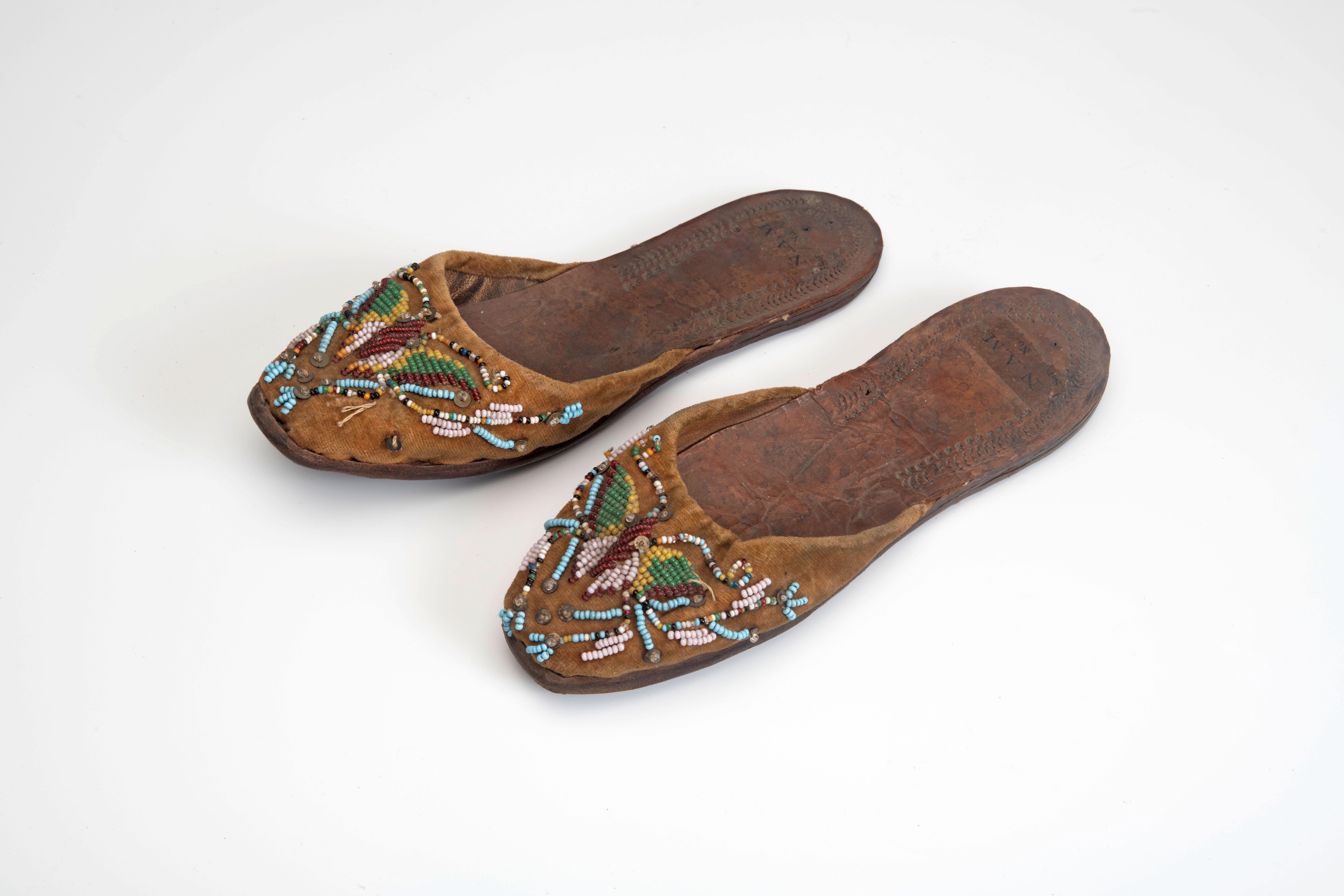 Een paar sloffen, met kraalwerk versierd