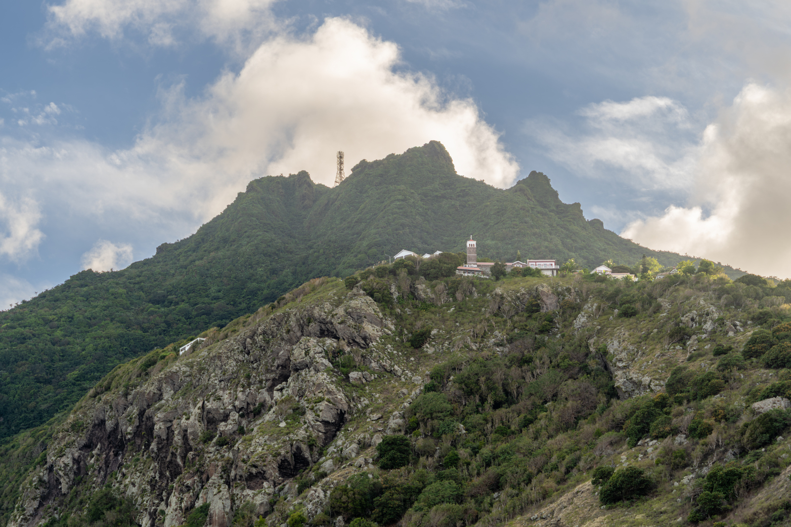 Mount Scenery met het dorp Zion's Hill in de voorgrond.