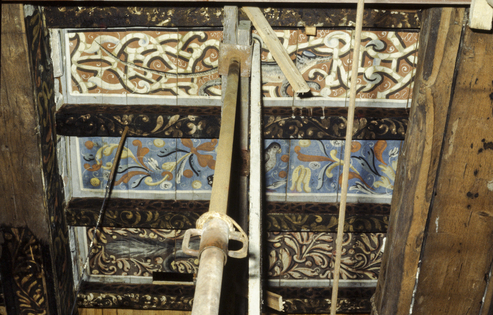 Interieur, beschilderd plafond op beschilderde balklaag