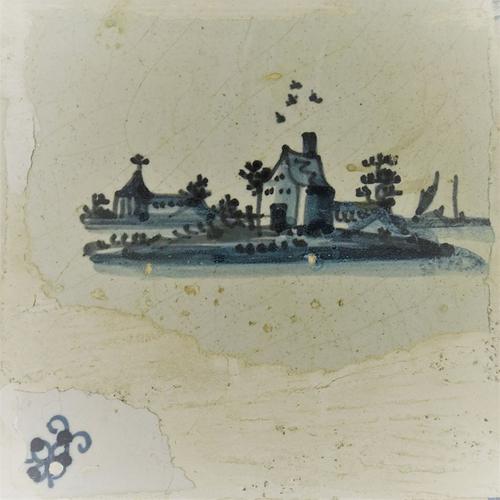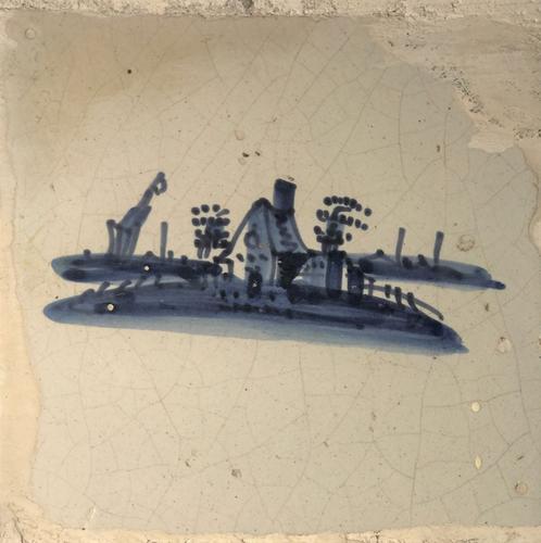 Tegel van aardewerk met tinglazuur voorstellende Lan...