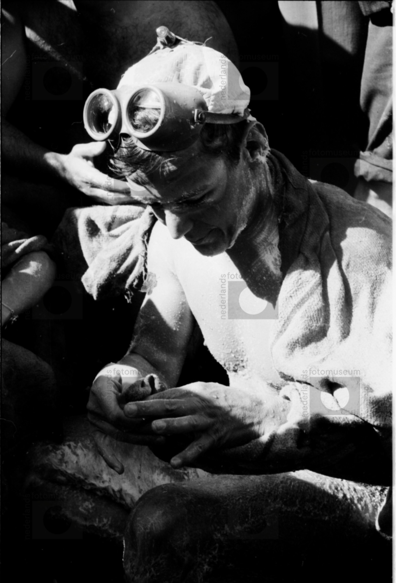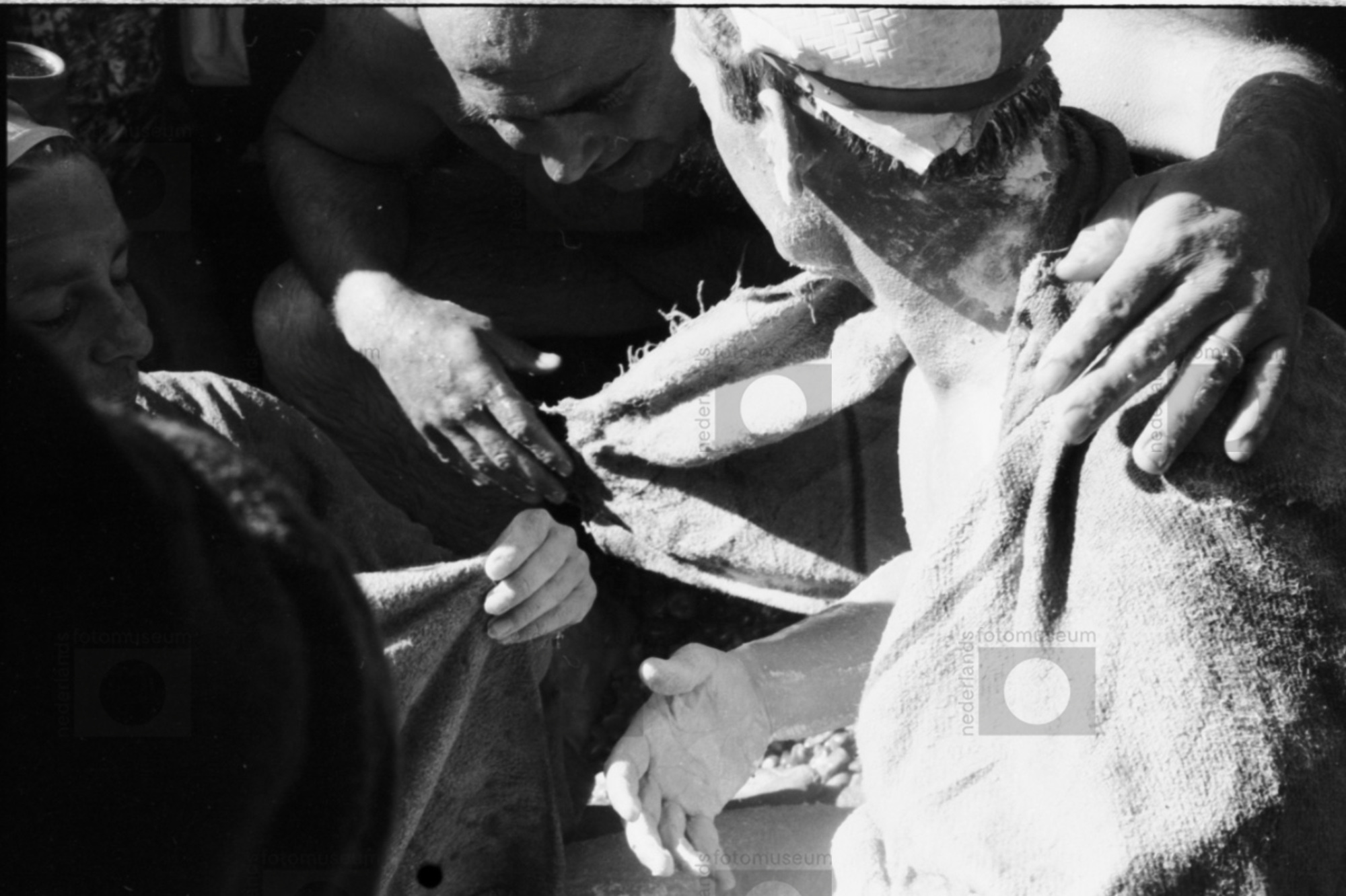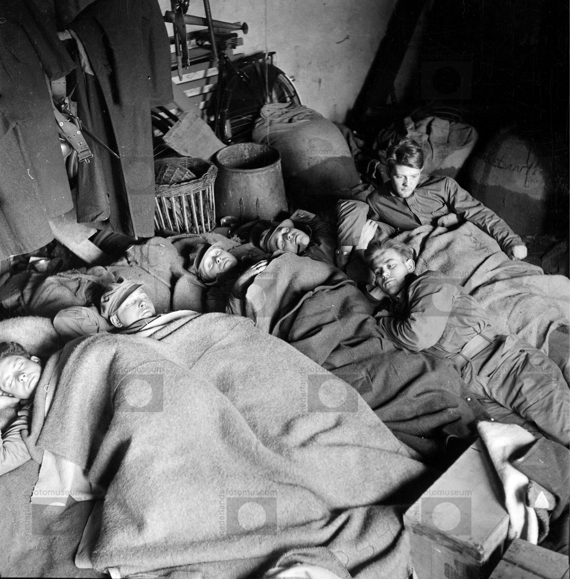 Slapende mannen in interieur vlak na de Watersnoodra...