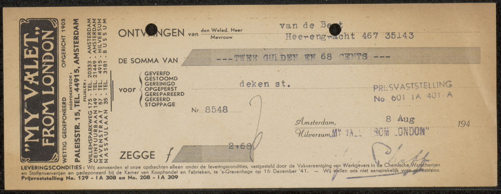 Kwitantie "My Valet" From London 8 aug. 1944
