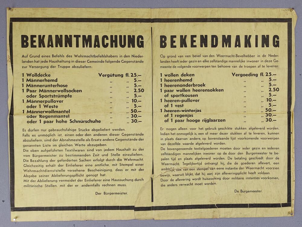 poster; bekendmaking burgemeester, vordering kleding...
