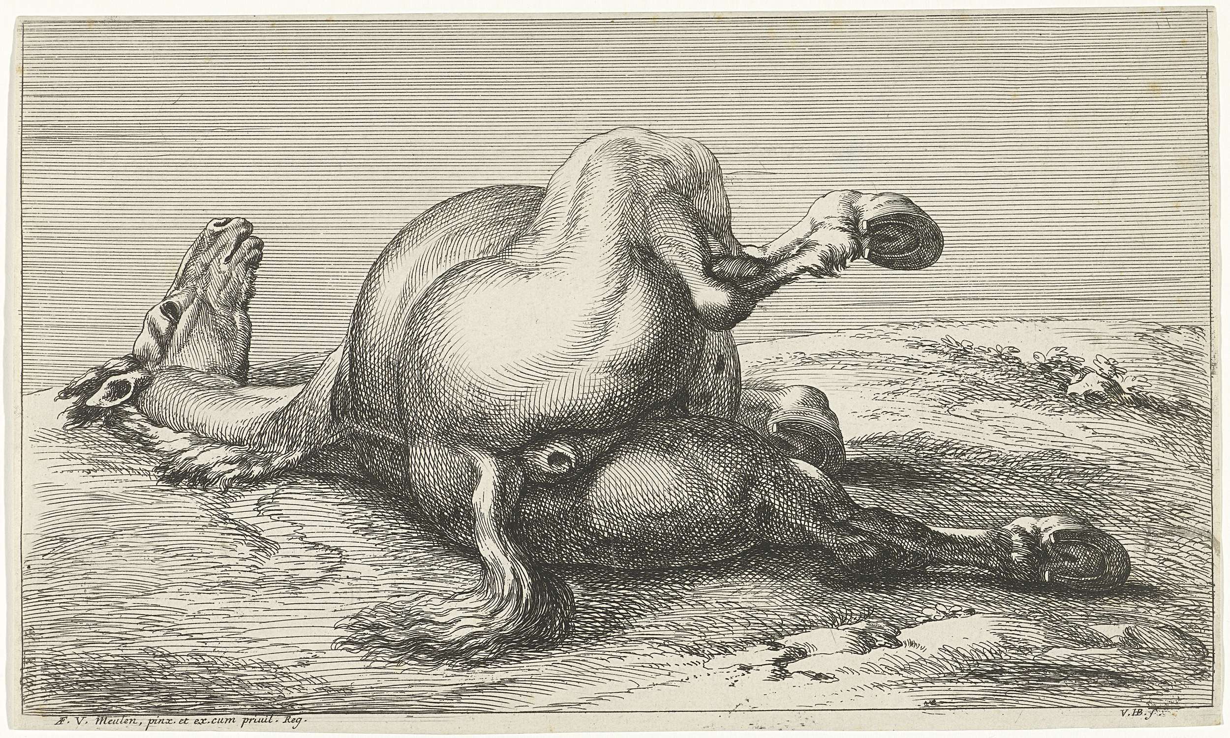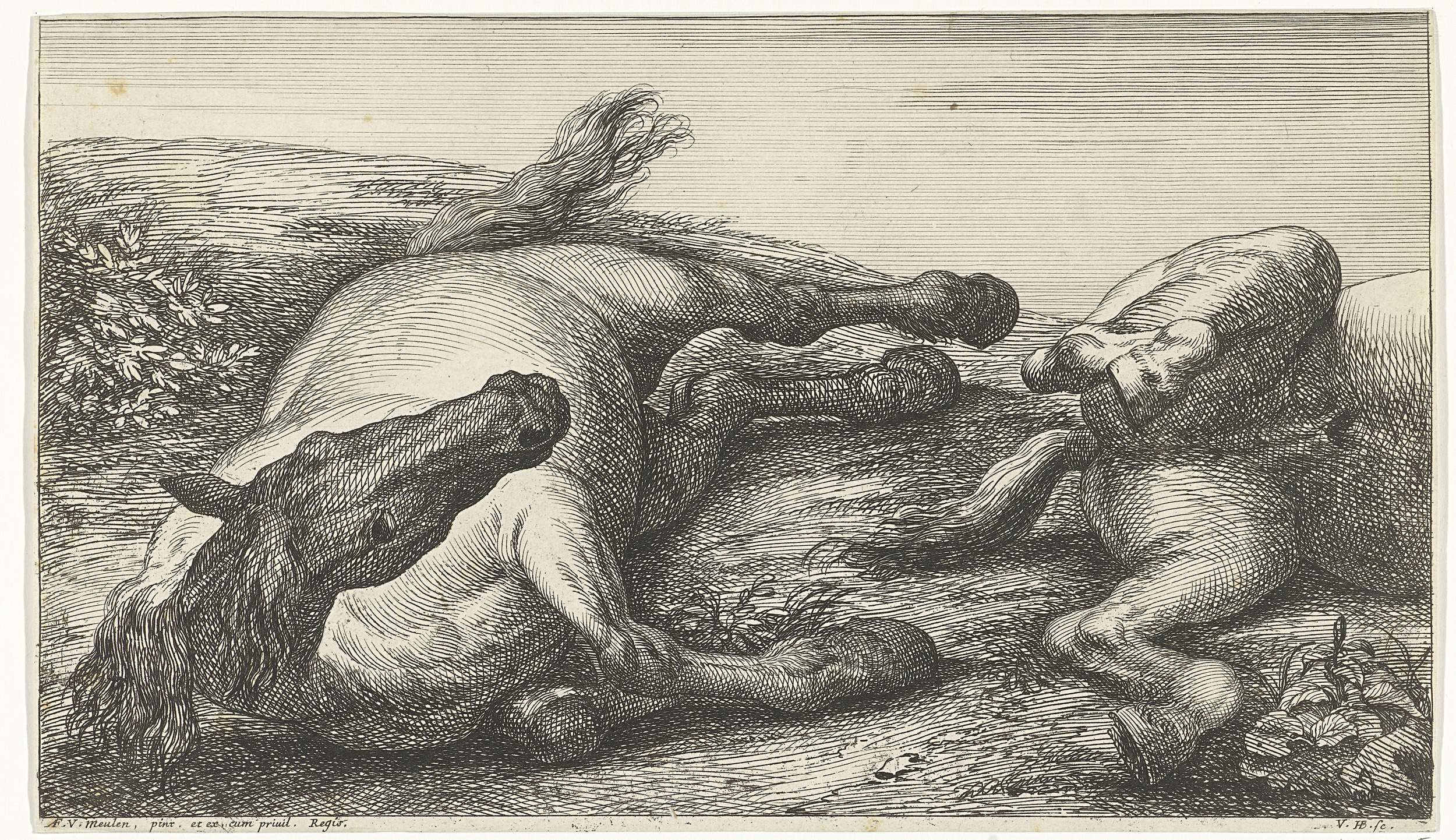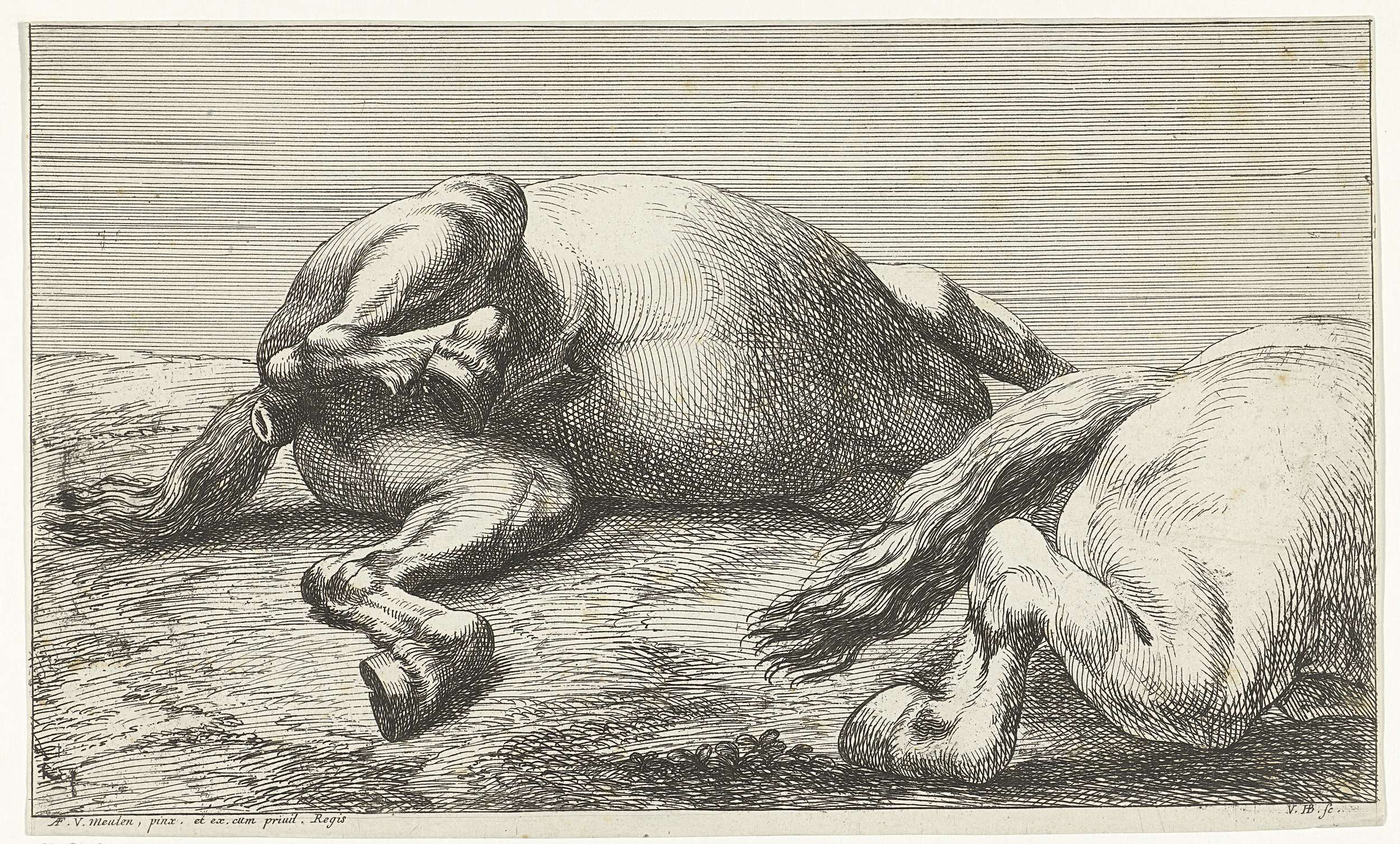 Twee gesneuvelde paarden waarvan de linker van voren...