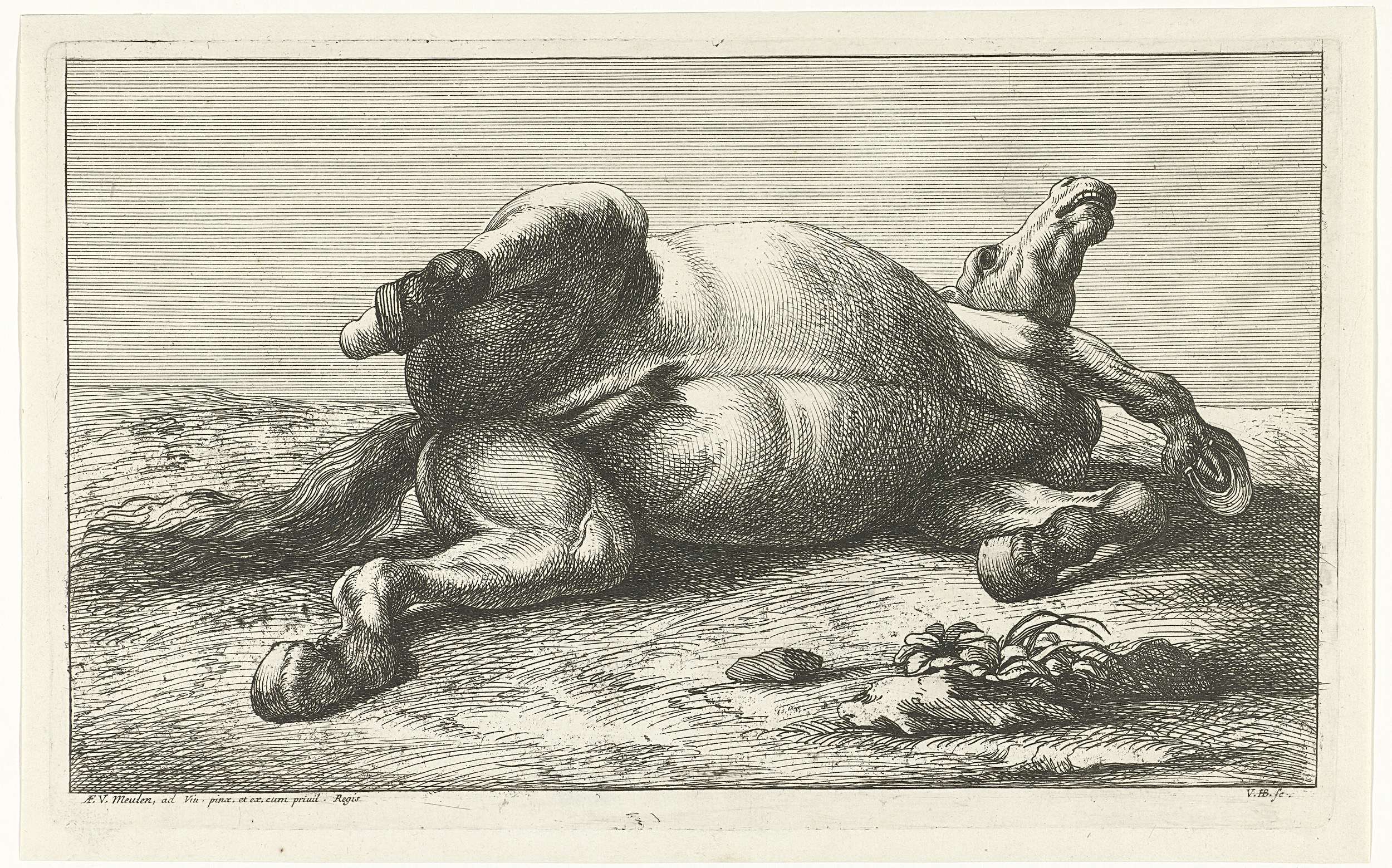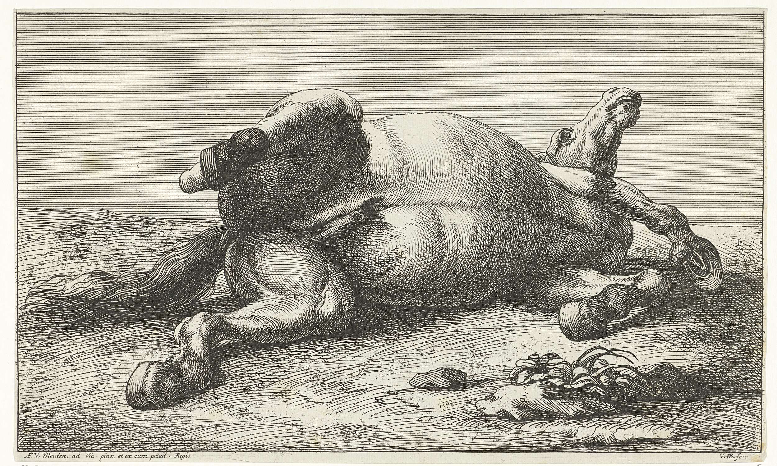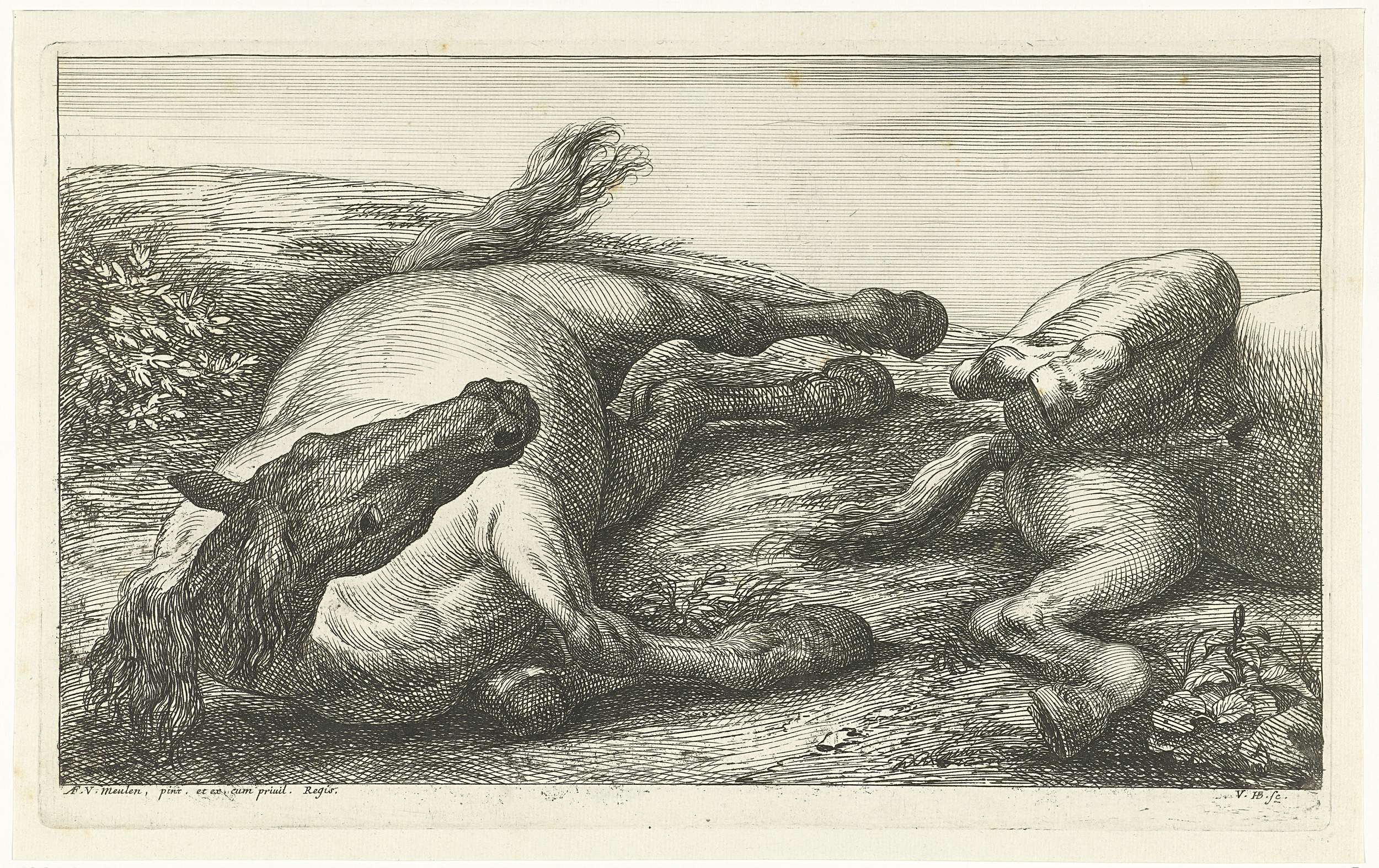 Twee gesneuvelde paarden waarvan de linker van voren...