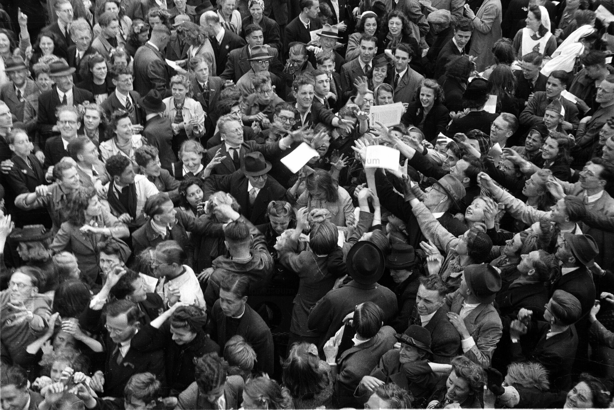 Geallieerde voertuigen rijden tijdens hun intocht vo...