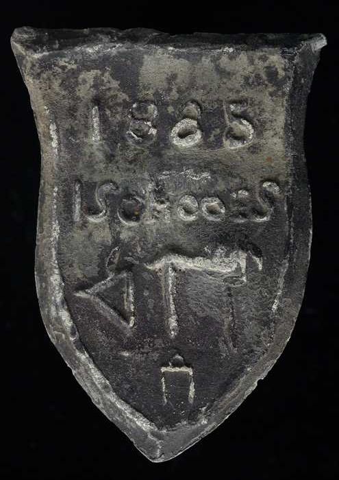Dakloodje, schildvormig afdekplaatje met "1885", "I ...