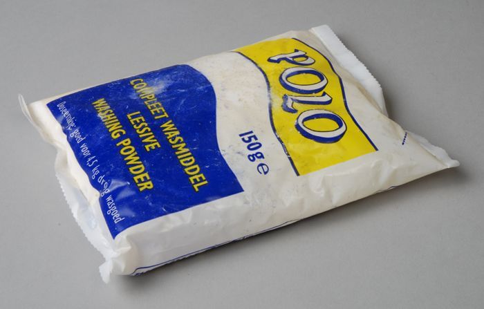 Rechthoekig zakje Polo wasmiddel, wit, blauw en geel