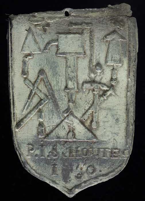 Dakloodje, schildvormig afdekplaatje met "P.I. Schou...