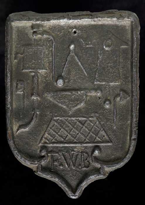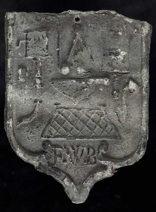 Dakloodje, schildvormig afdekplaatje met initialen "...