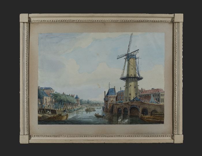 Aquarel met de Blaauwe Molen nabij de Hofpoort