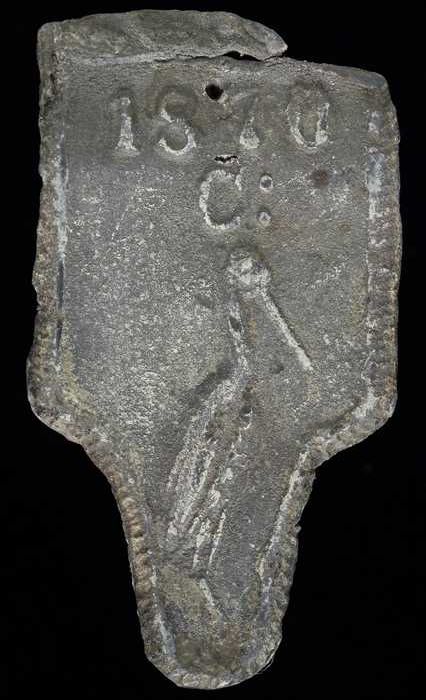 Dakloodje, schildvormig afdekplaatje met "1870 C" en...