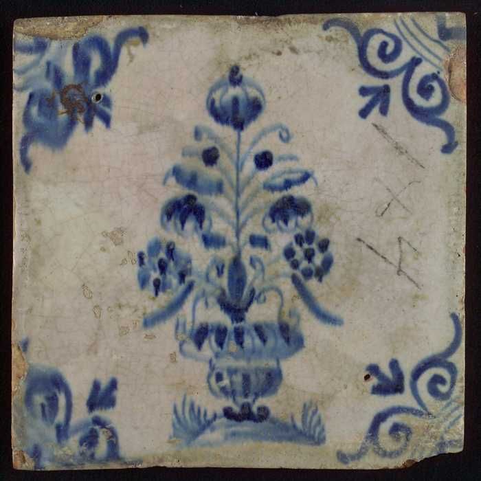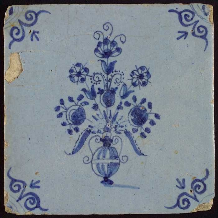 Tegel, bloemenvaas op grondje, blauw decor, hoekmoti...