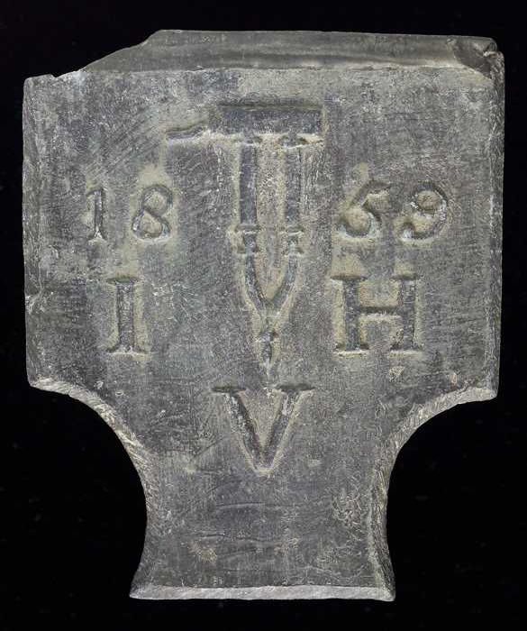 Dakloodje, schildvormig afdekplaatje met "1859", ini...