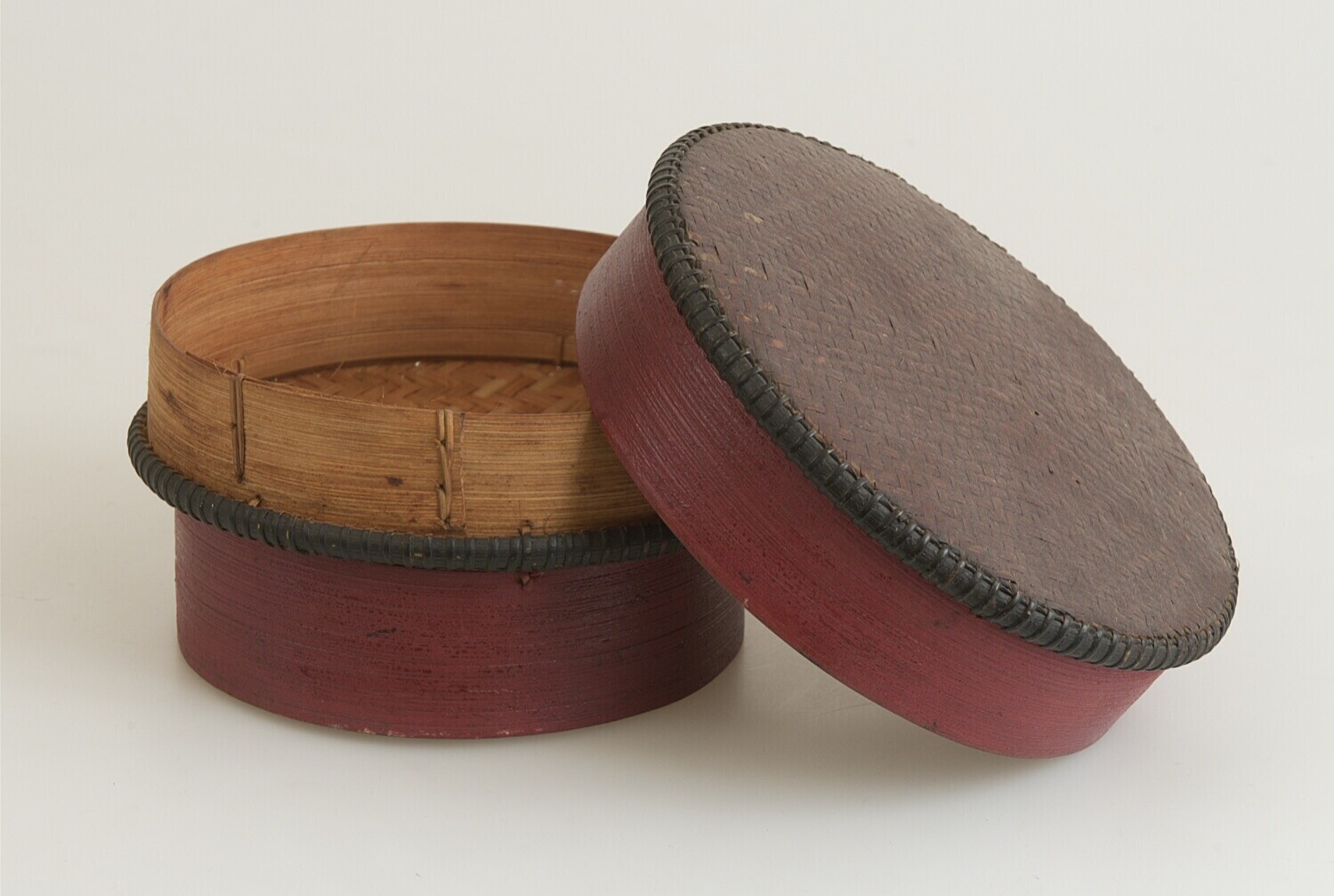 Bedakdoosje met deksel, hout, rood met gouden banden.