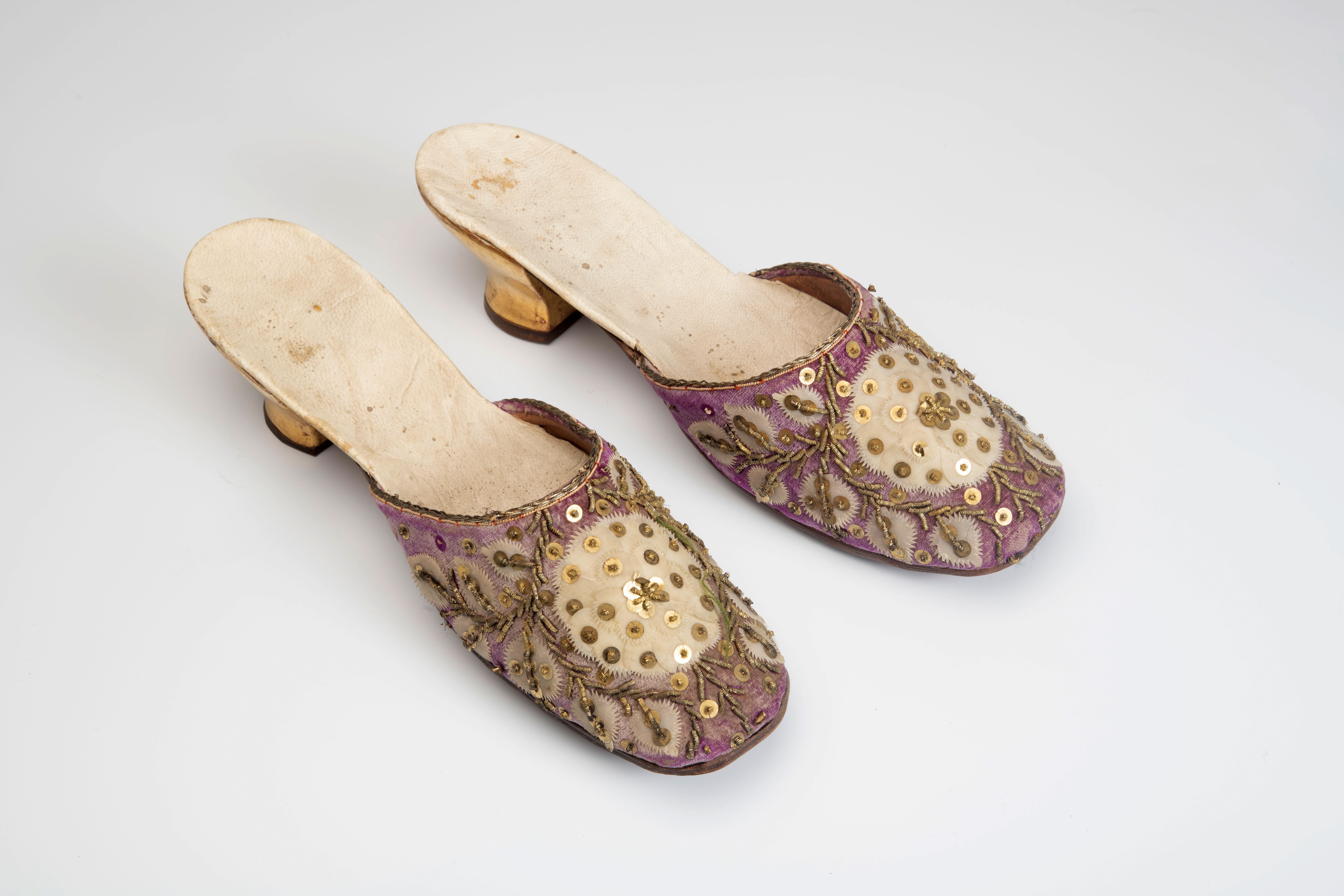 Een paar muiltjes met vergulde hak van paars fluweel...