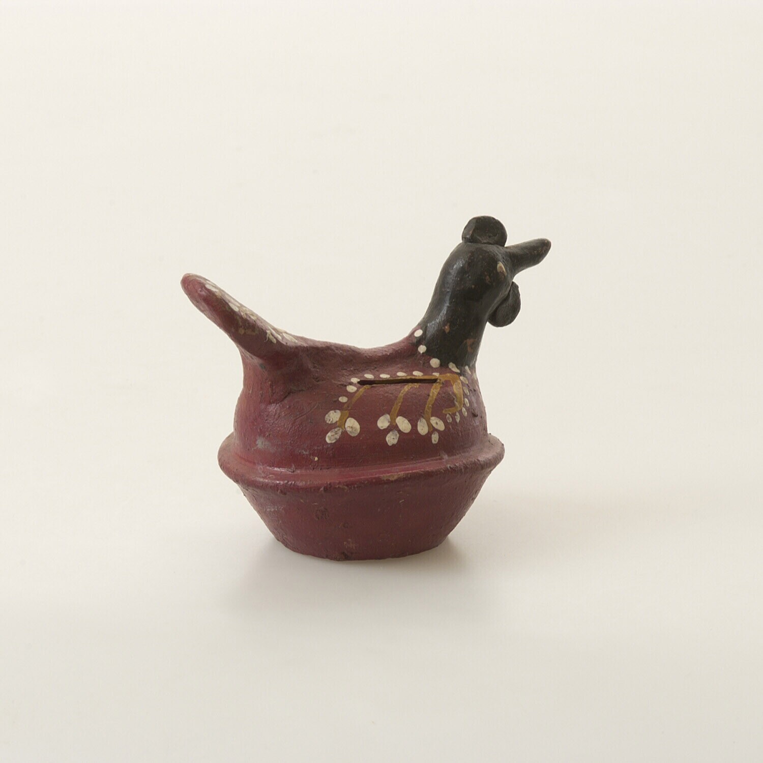 Speelgoedvogel van klei, glas en koper