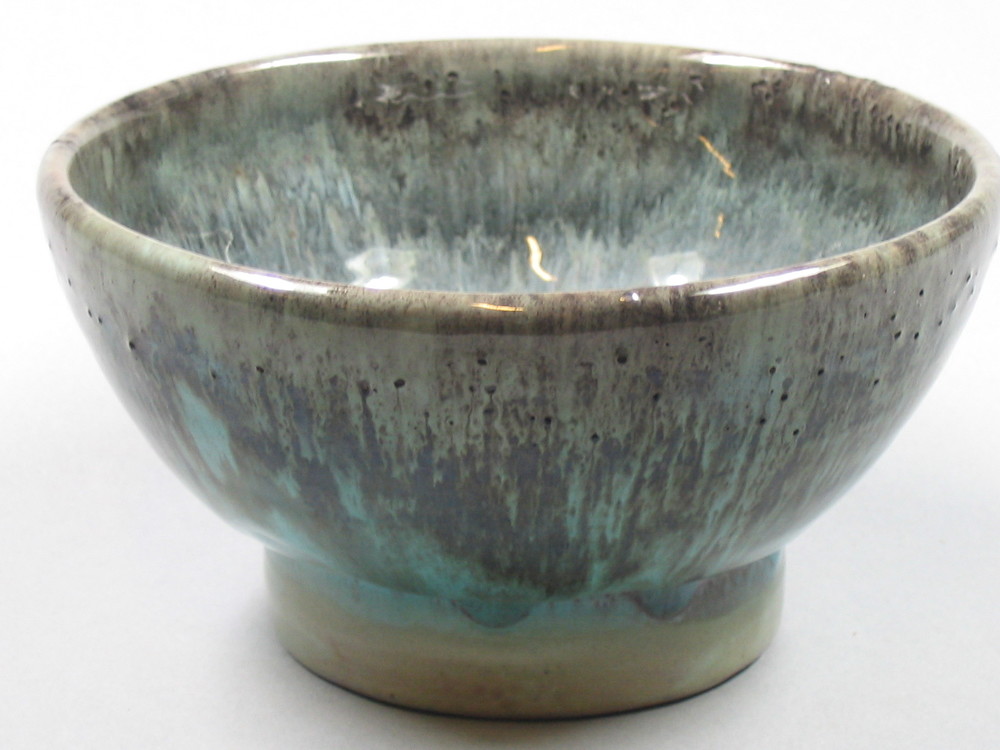 kom van keramiek, zeegroen met bruinzwart vanaf de r...