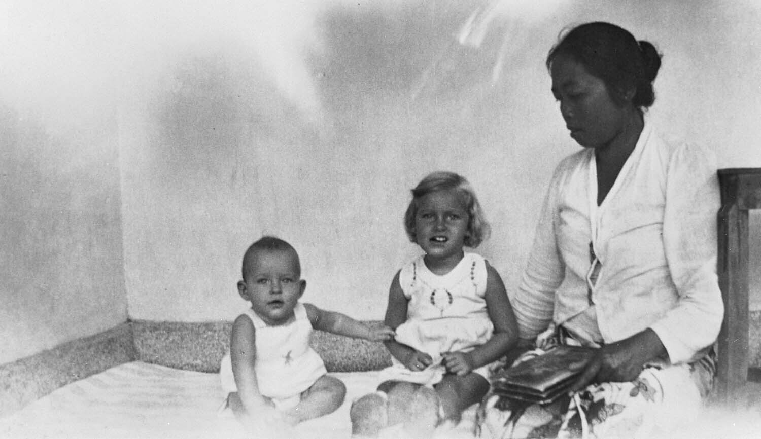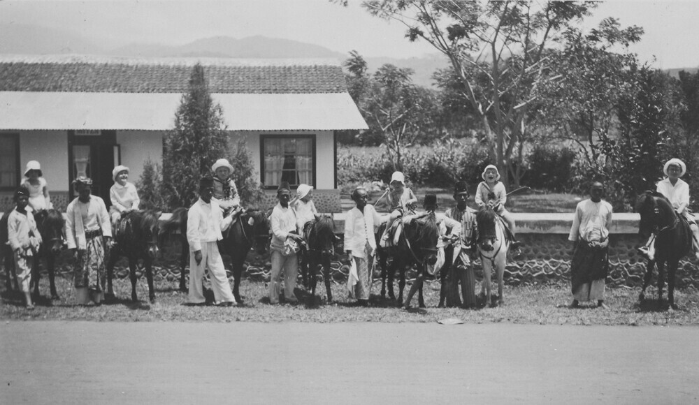 Europese vrouwen in de tuin met Javaans bedienend pe...