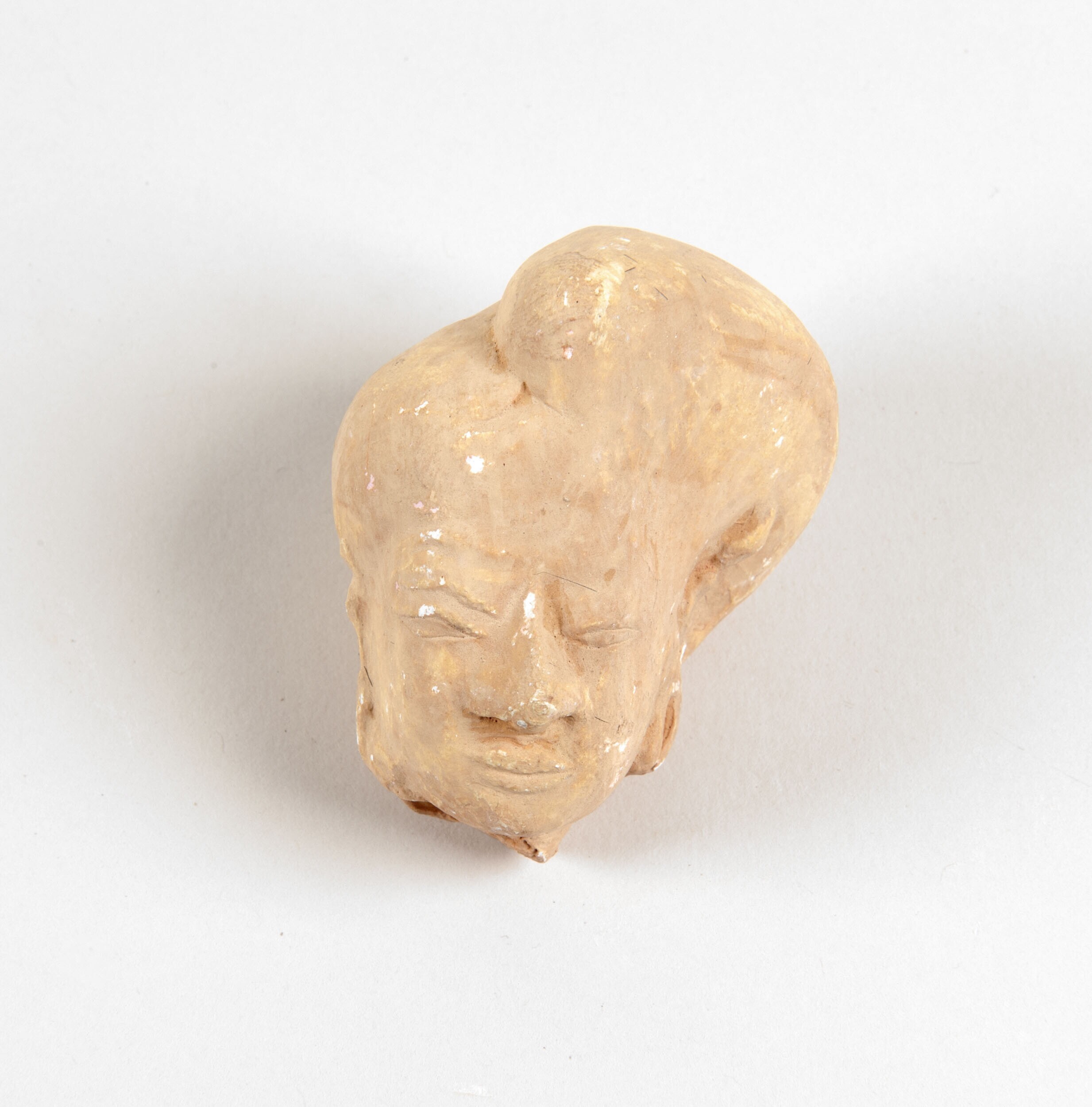 Gipsafgietsel Terracottakop met puntmuts en kleine s...