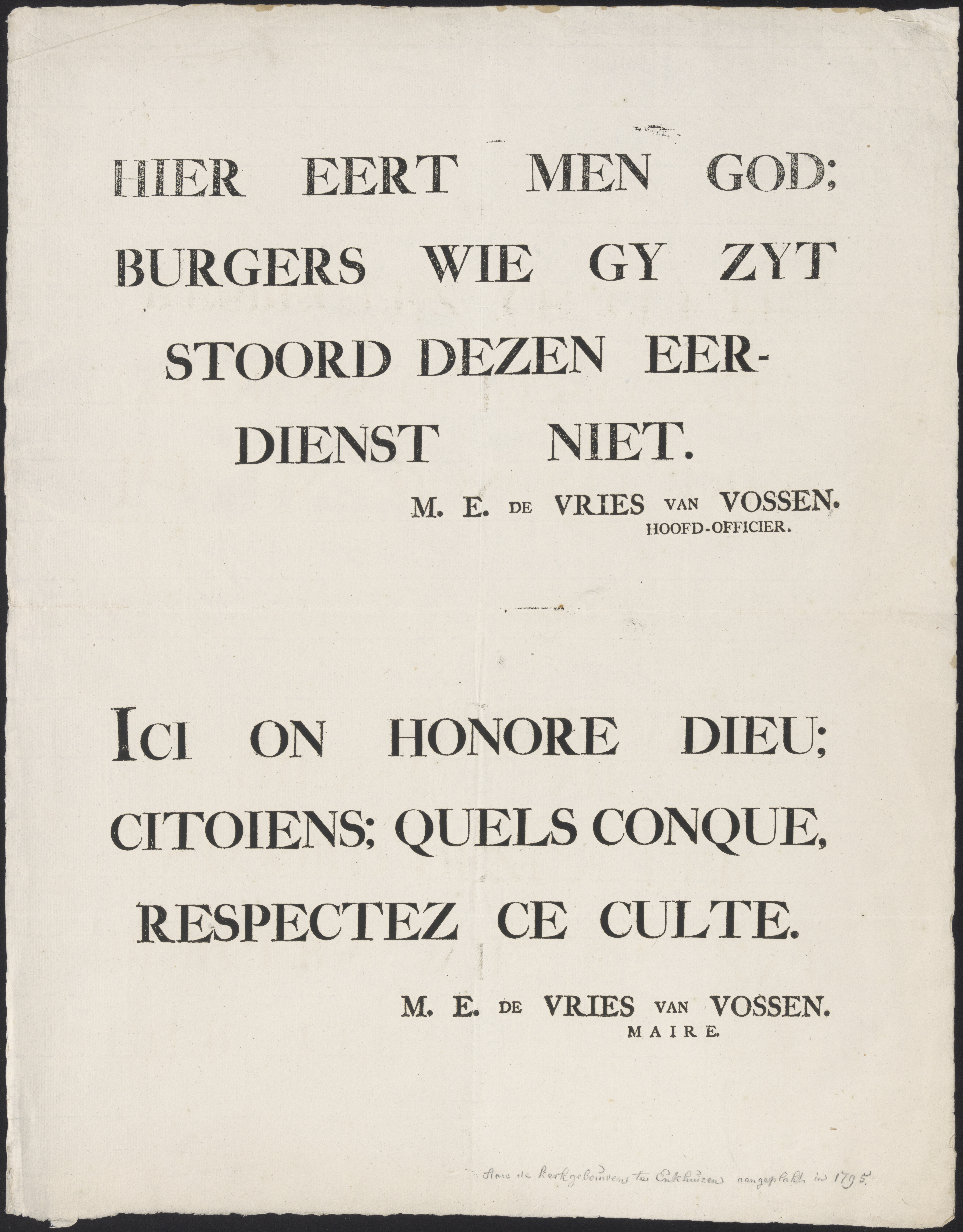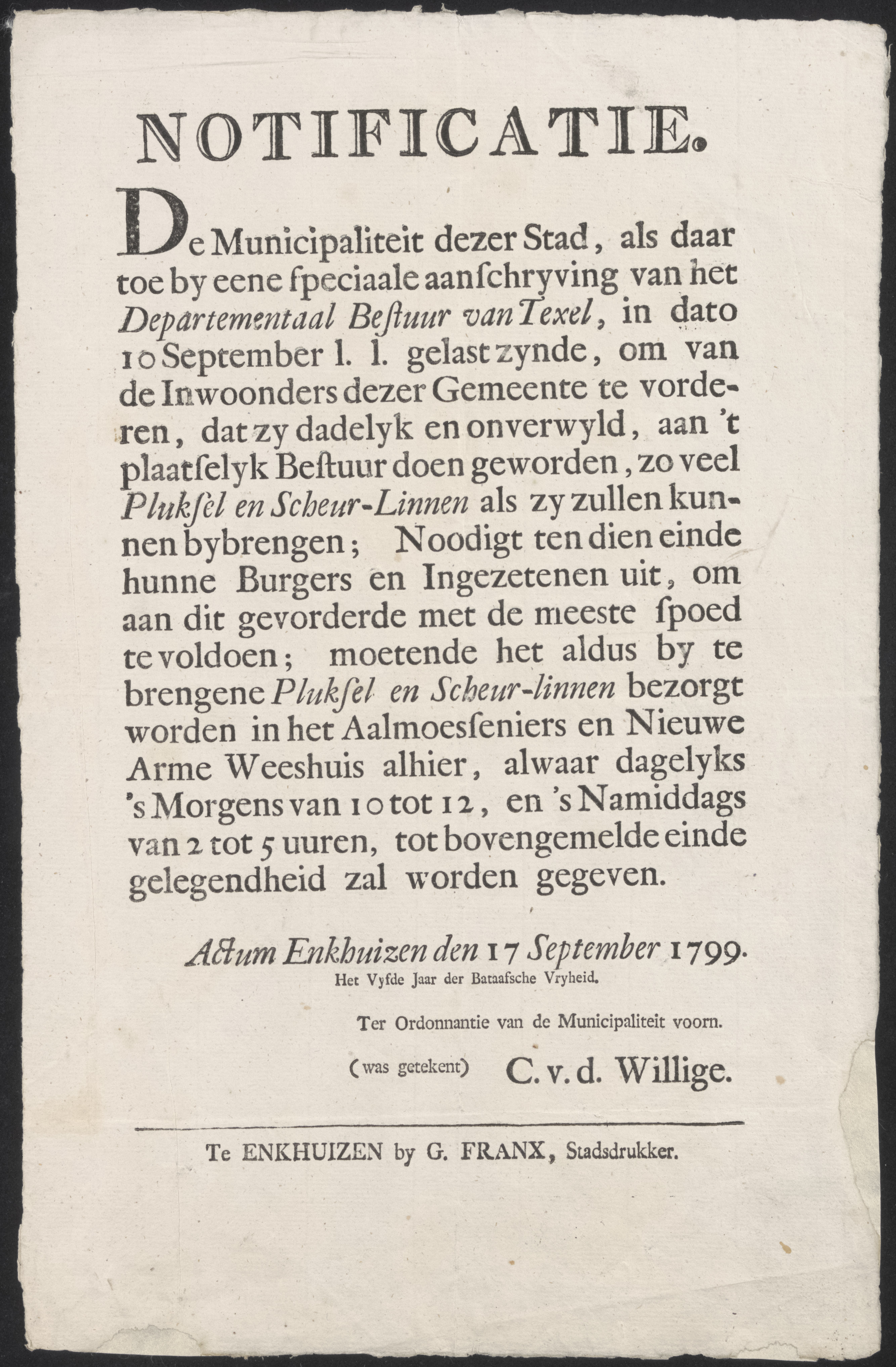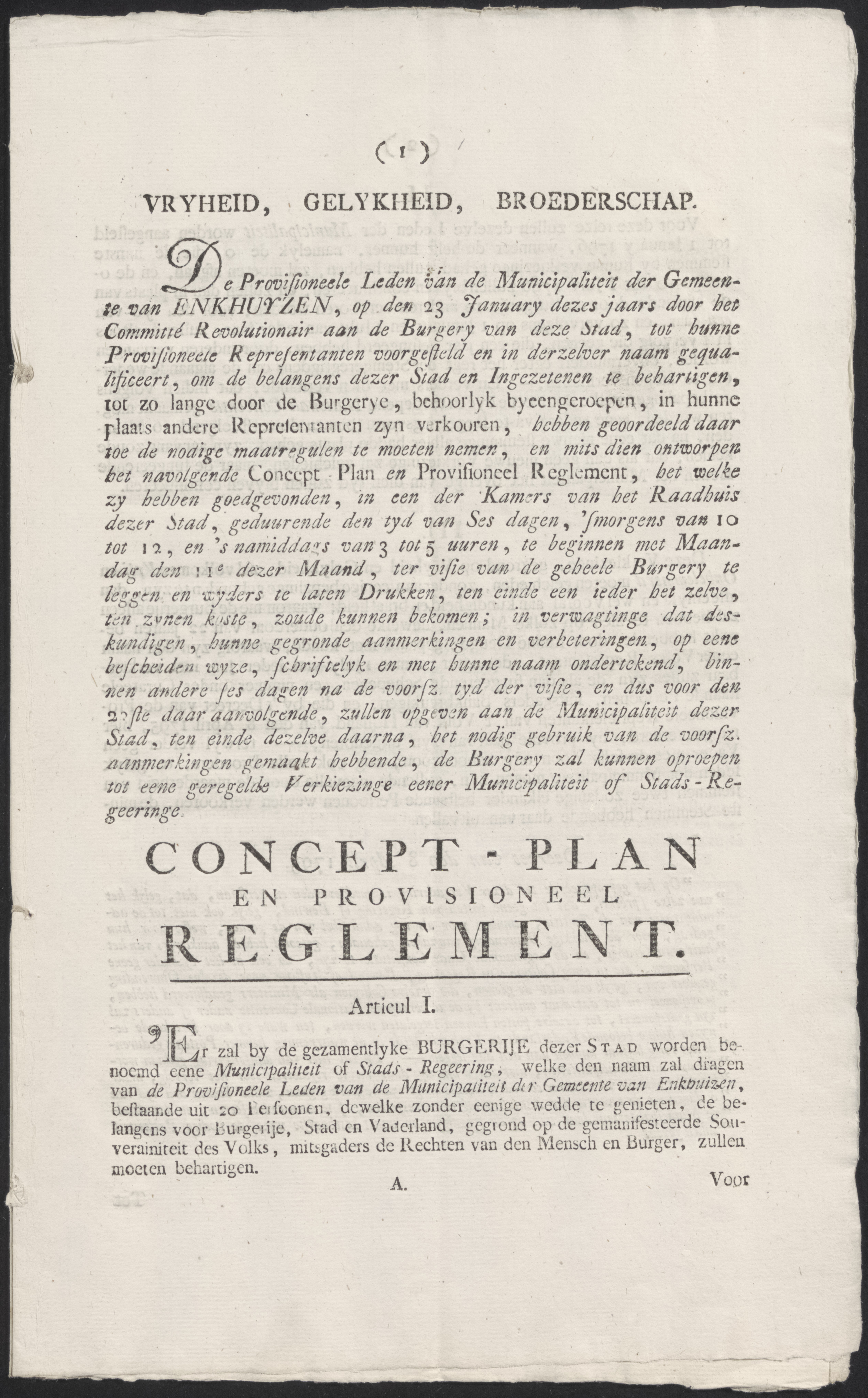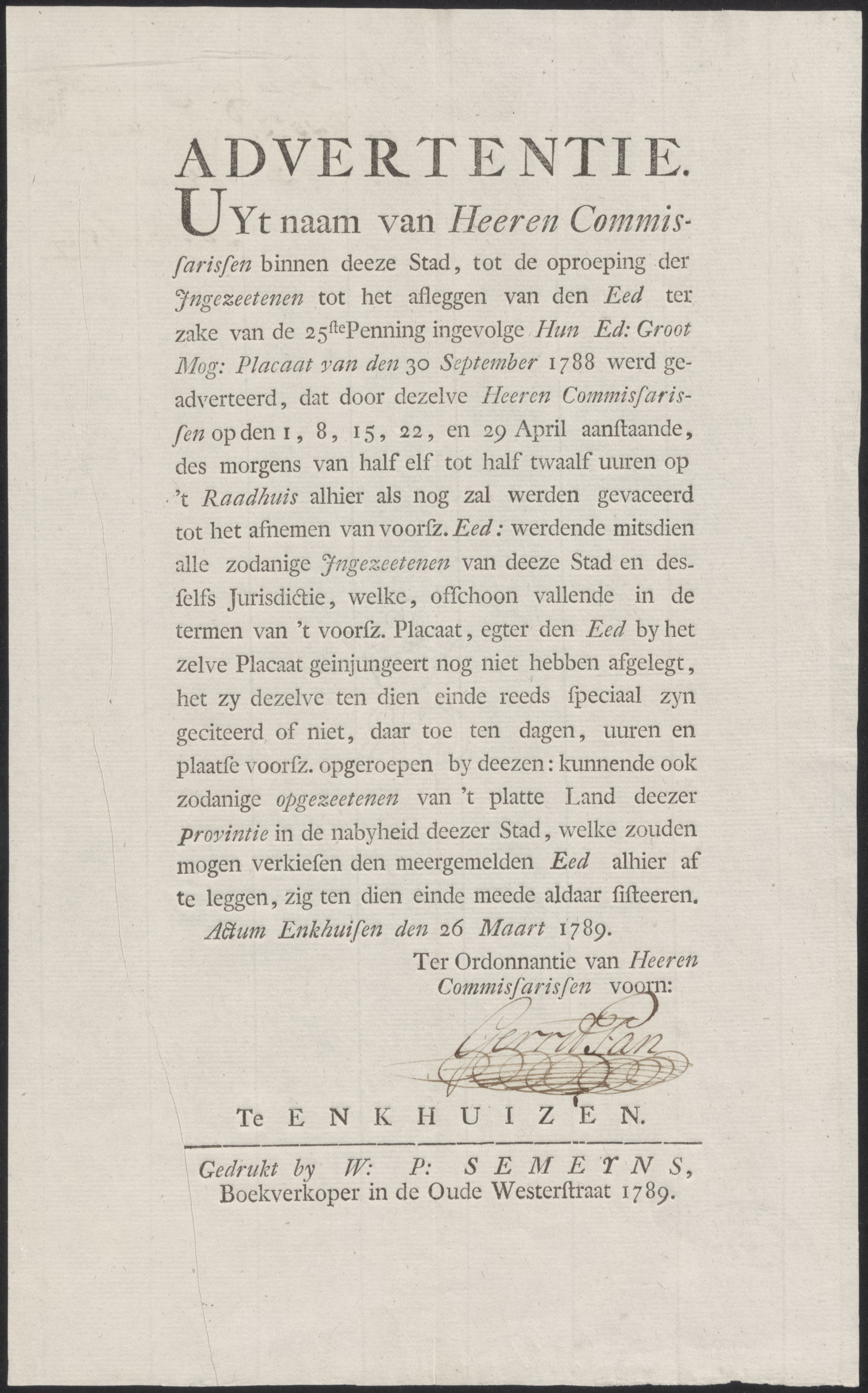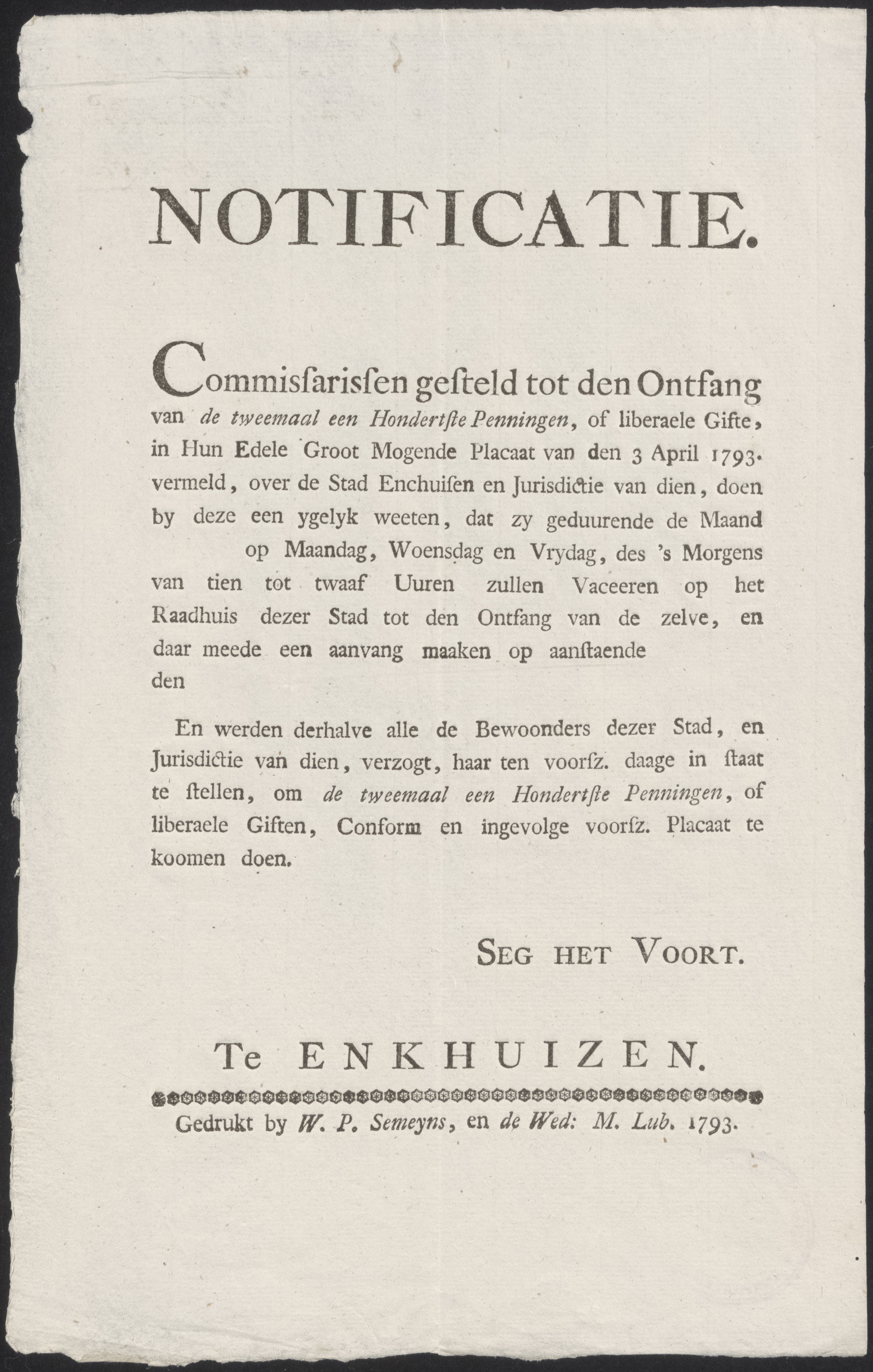 Aankondiging van De Heeren Twintigh Raaden der Stadt...