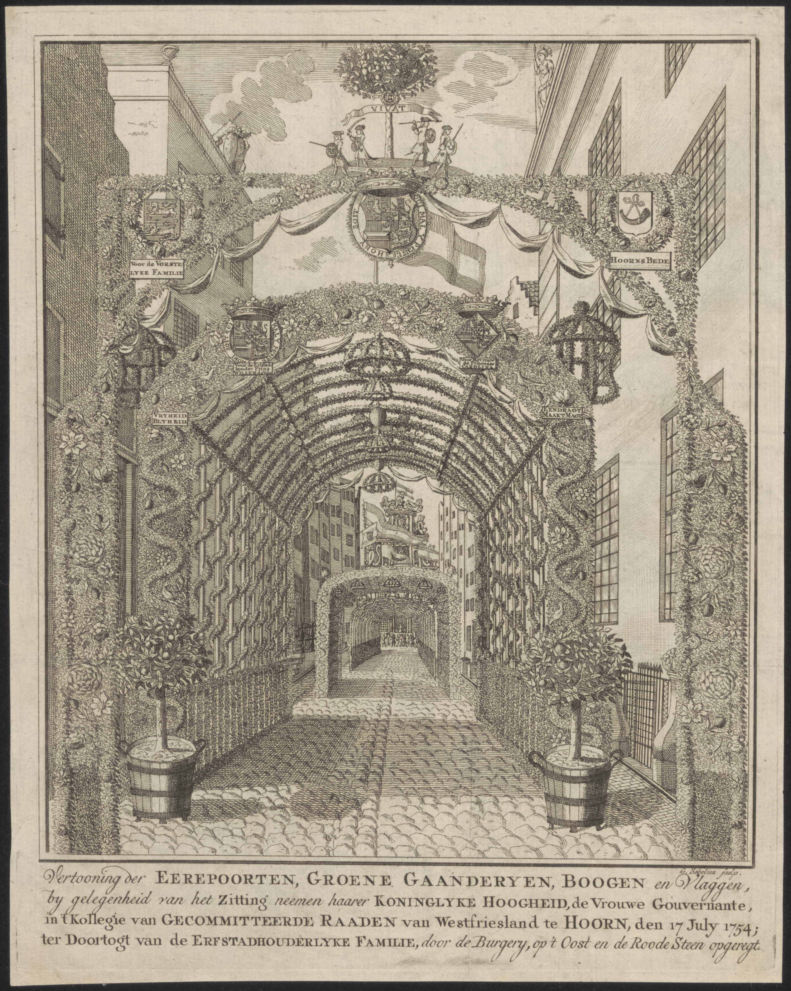 Vertooning der Eerepoorten, groene gaanderyen, booge...