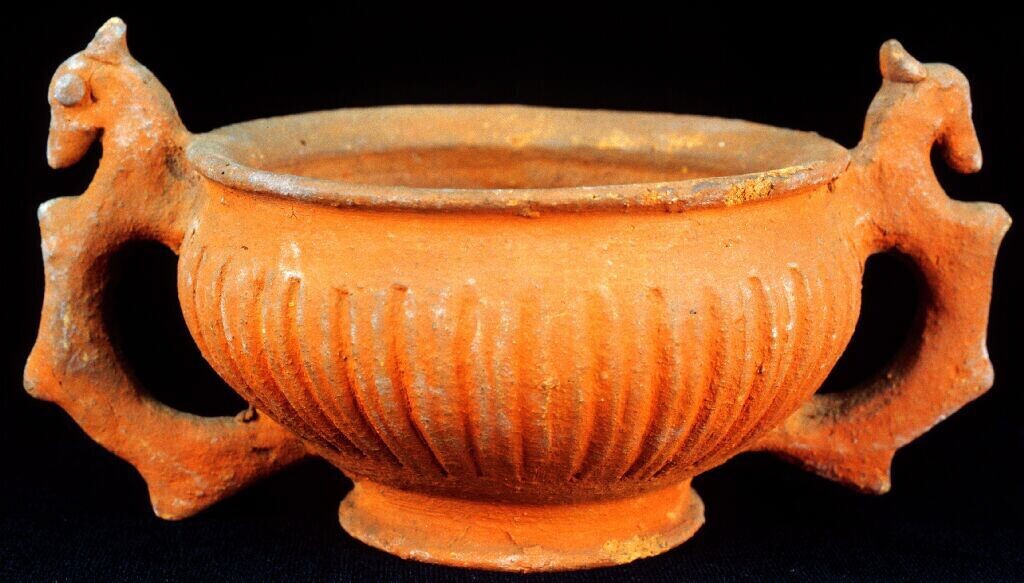 Aardewerken schenkkan in de vorm van een hoge melkkan