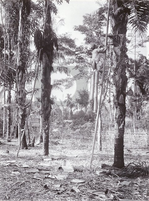 Aftappen van aren palmbomen, Sumedang, Java, Indones...