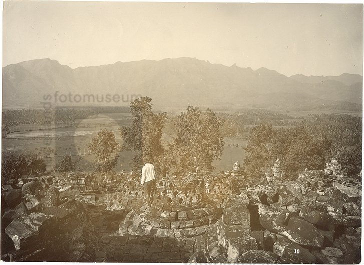 De fotograaf Kassian Céphas poseert bovenop de Borob...