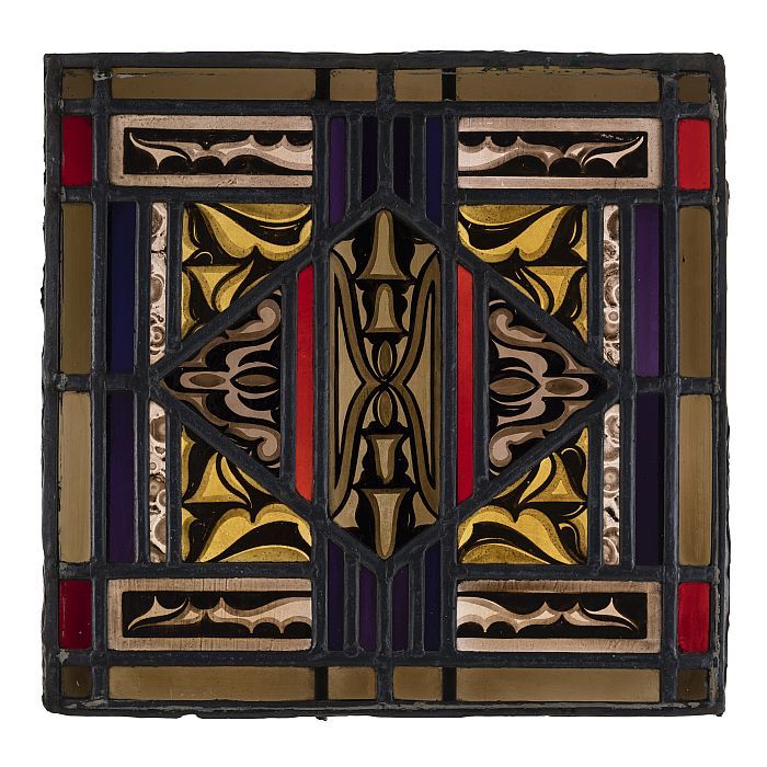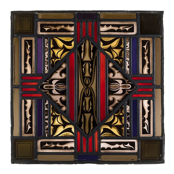 Glas-in-loodraam apotheek, met afbeelding retort op ...