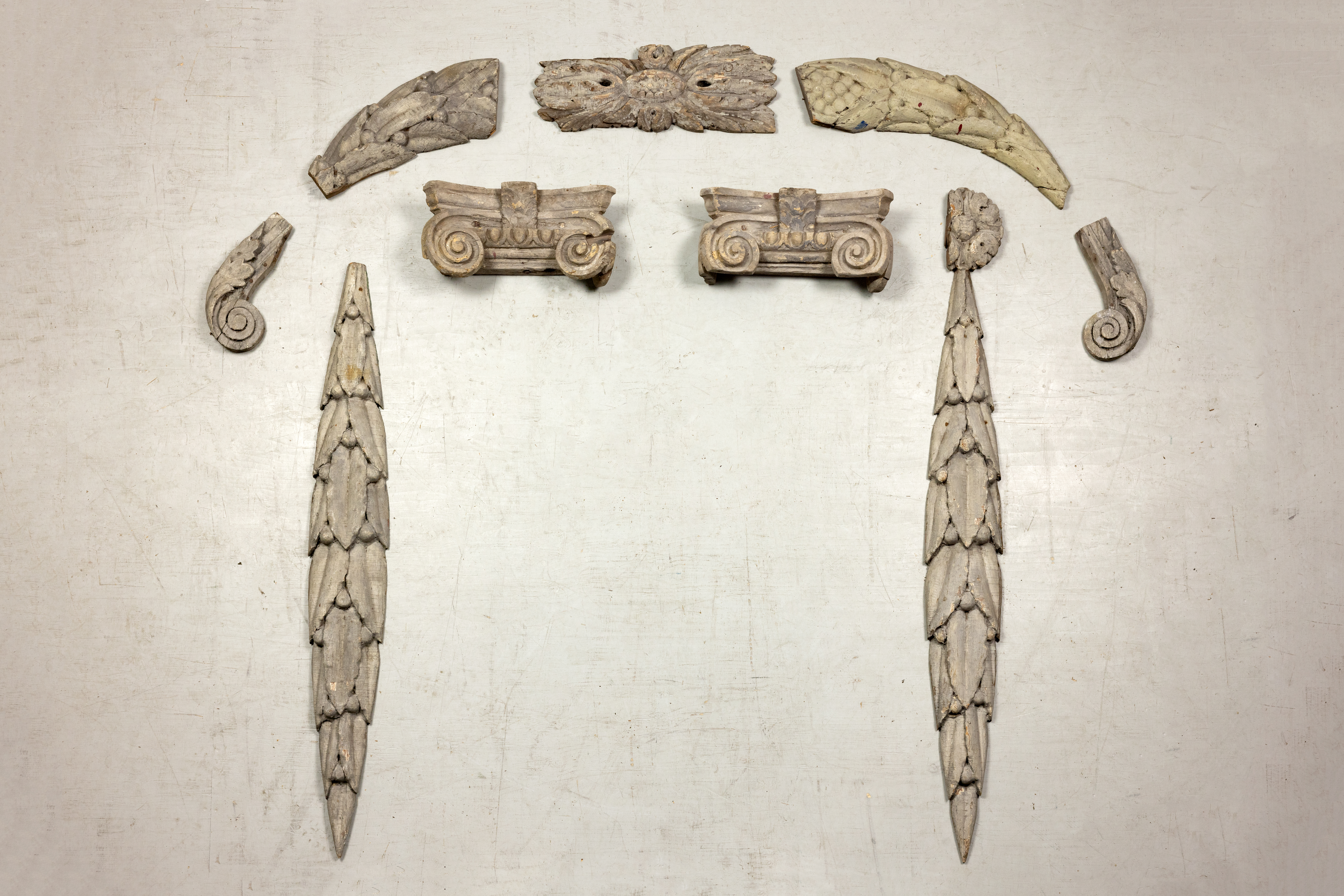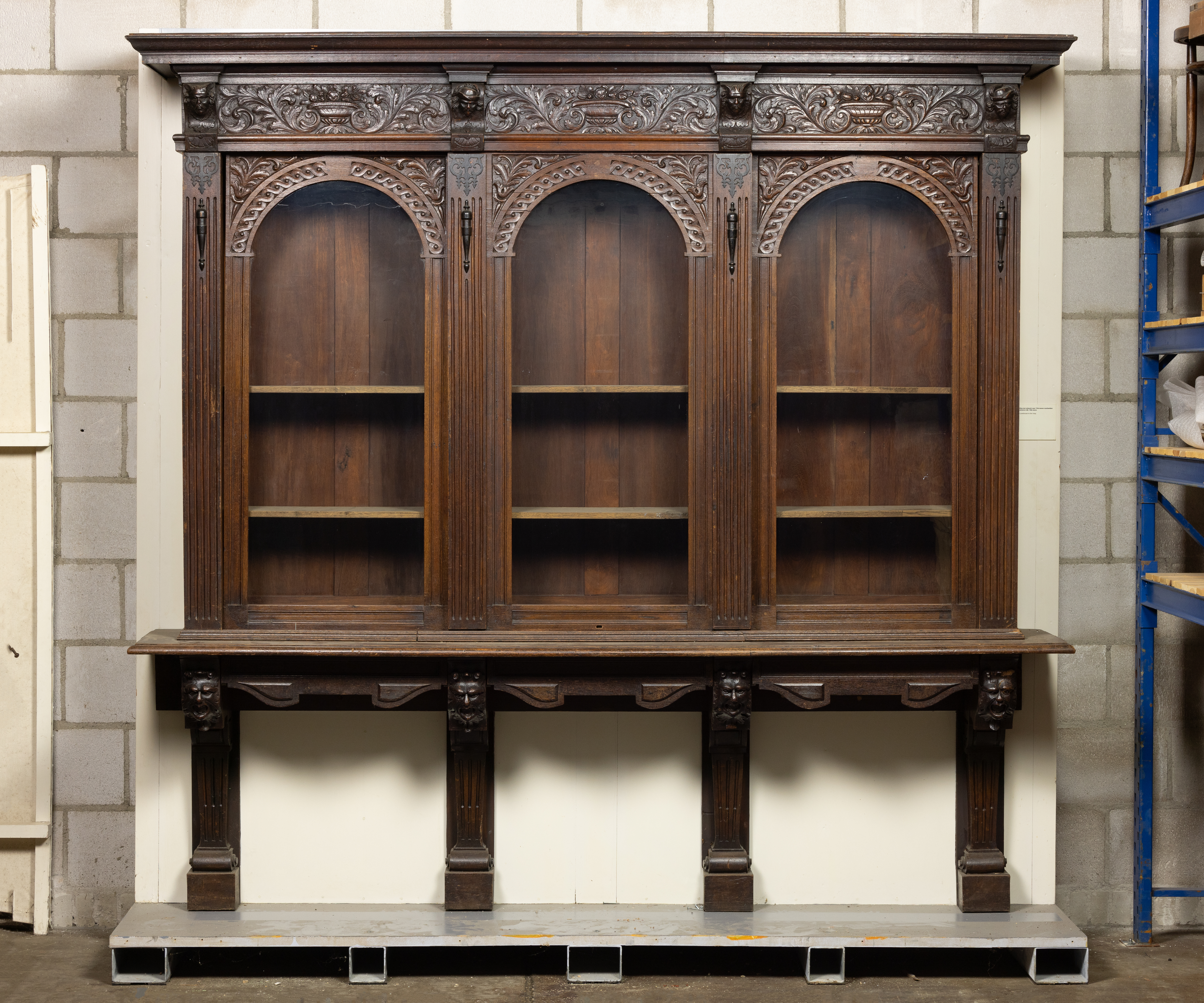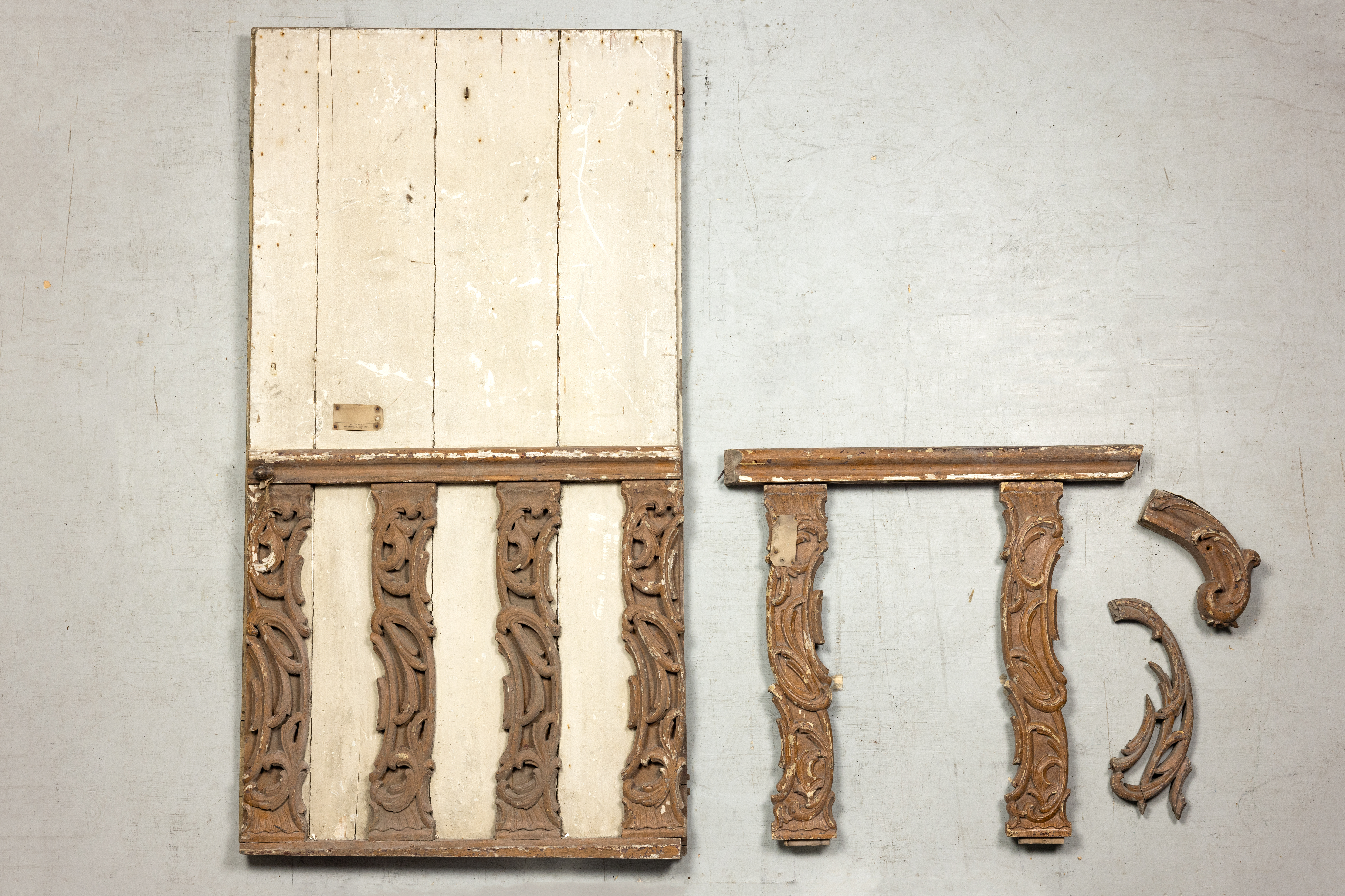 Ensemble huisraad met houtsnijwerk versiering, met n...