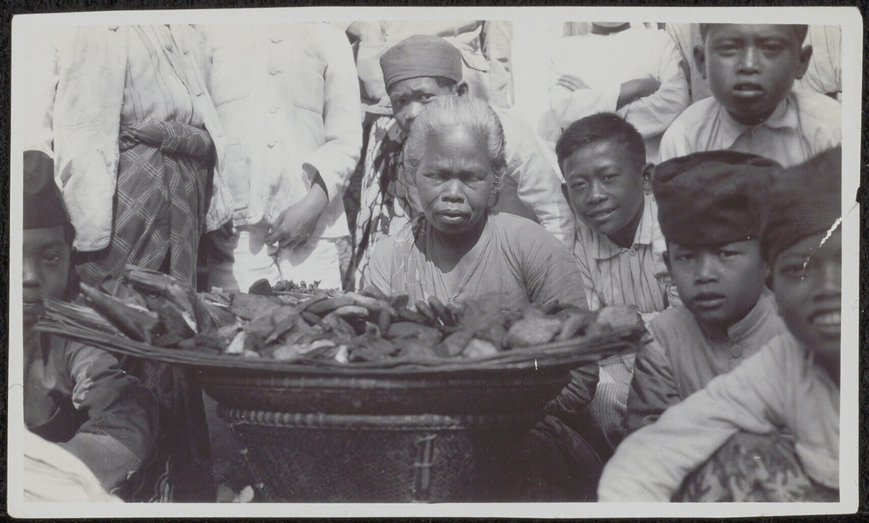 Portret van een groep kinderen bij een verkoopster v...