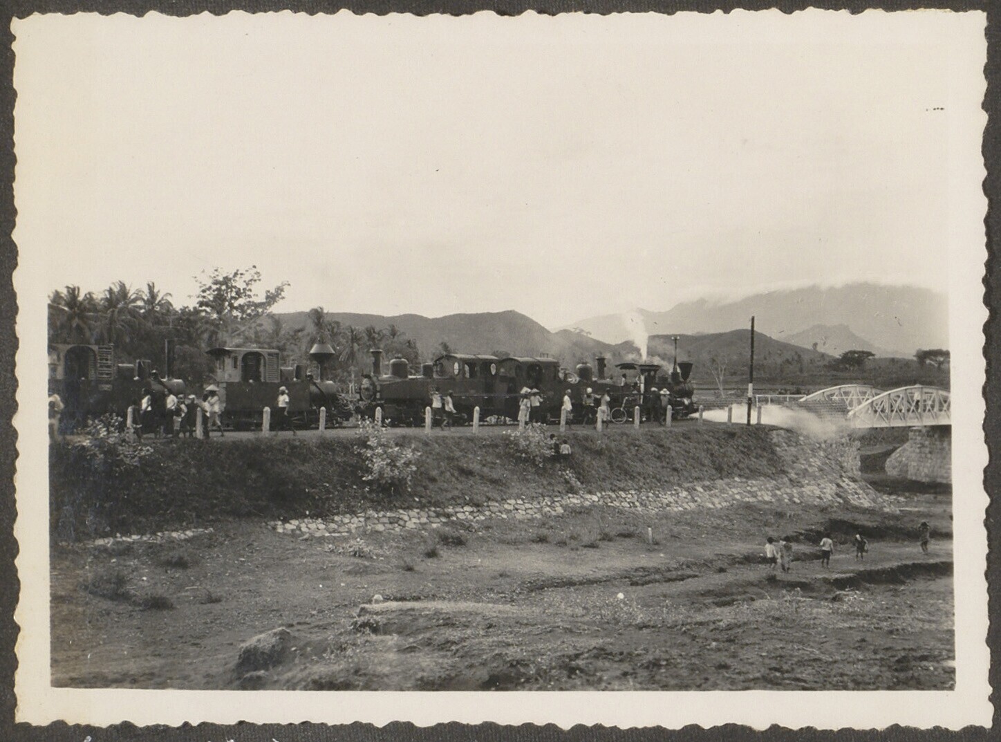 Vijf treinlocomotieven passeren de brug van Tjiheull...