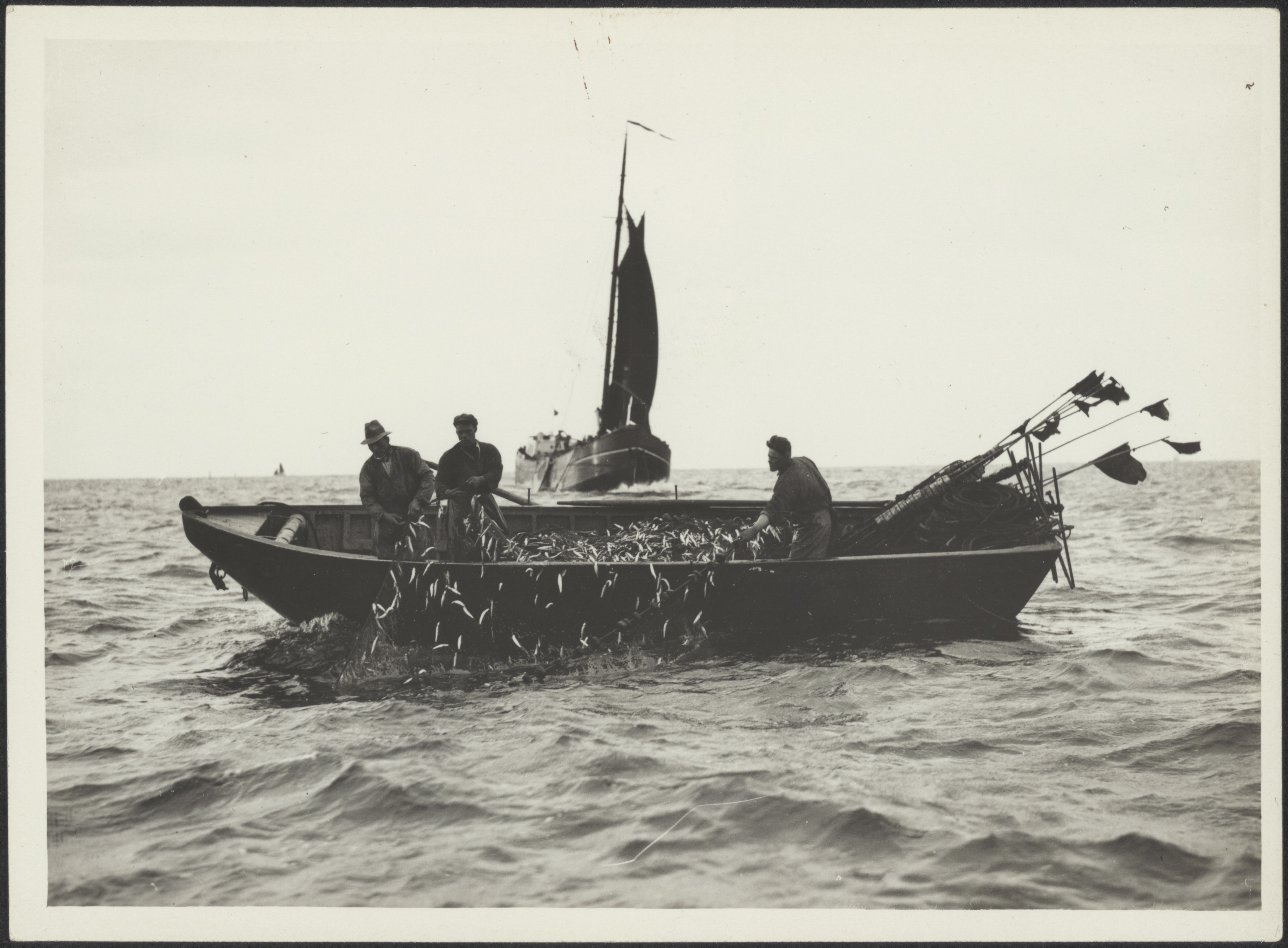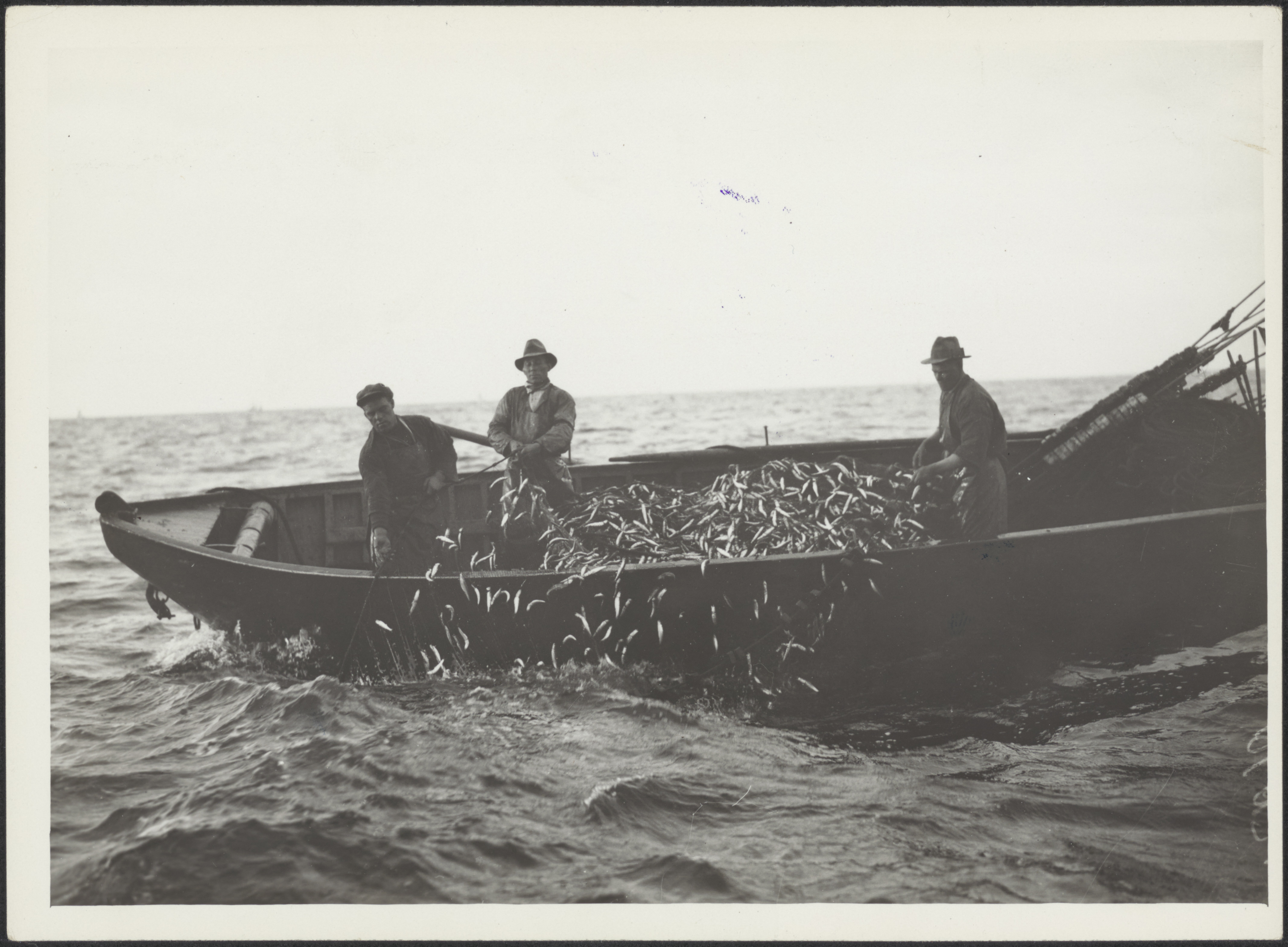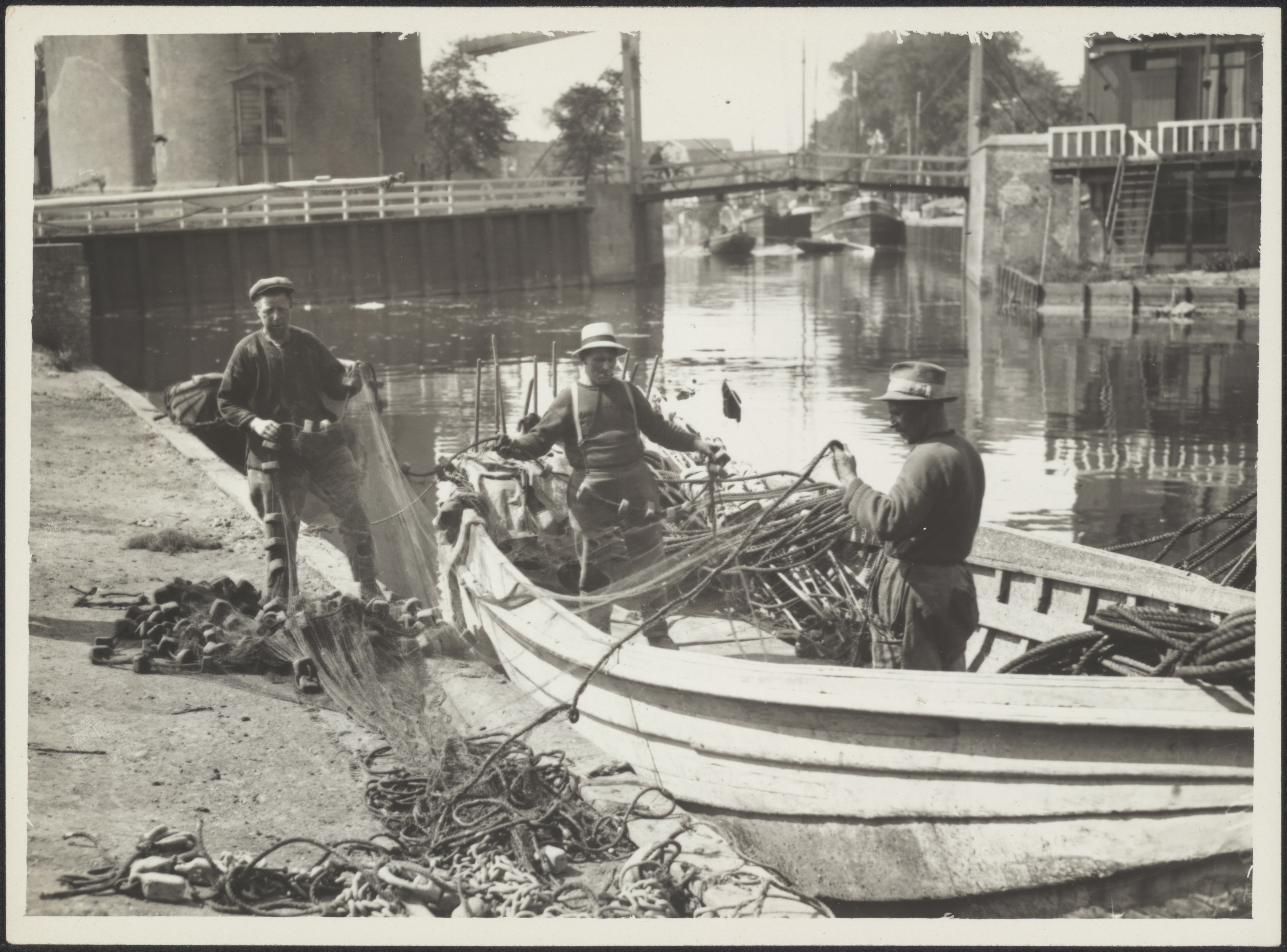 Drie mannen in een boot die een visnet binnen halen ...