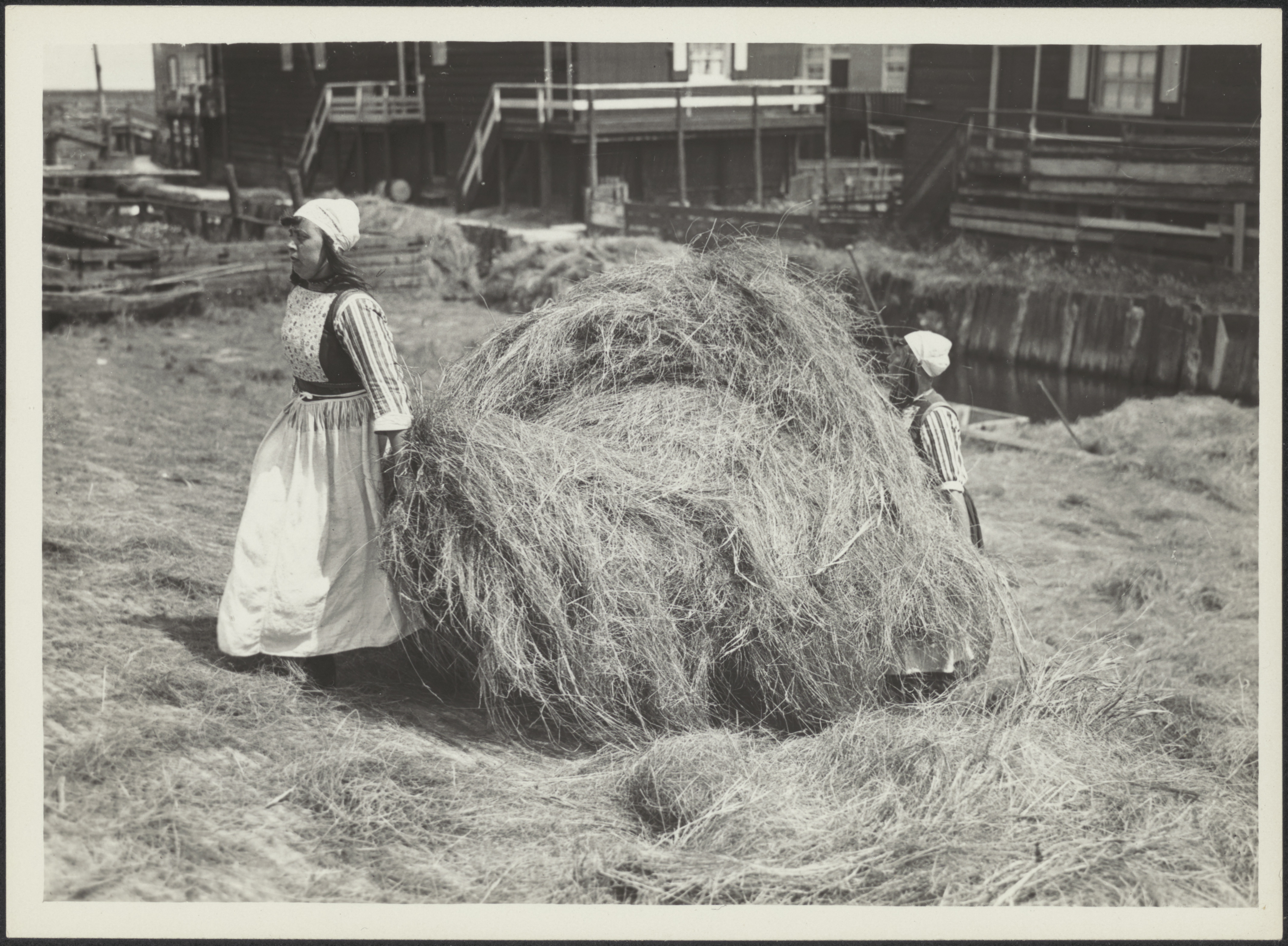 Marker vrouw met kind aan het hooien