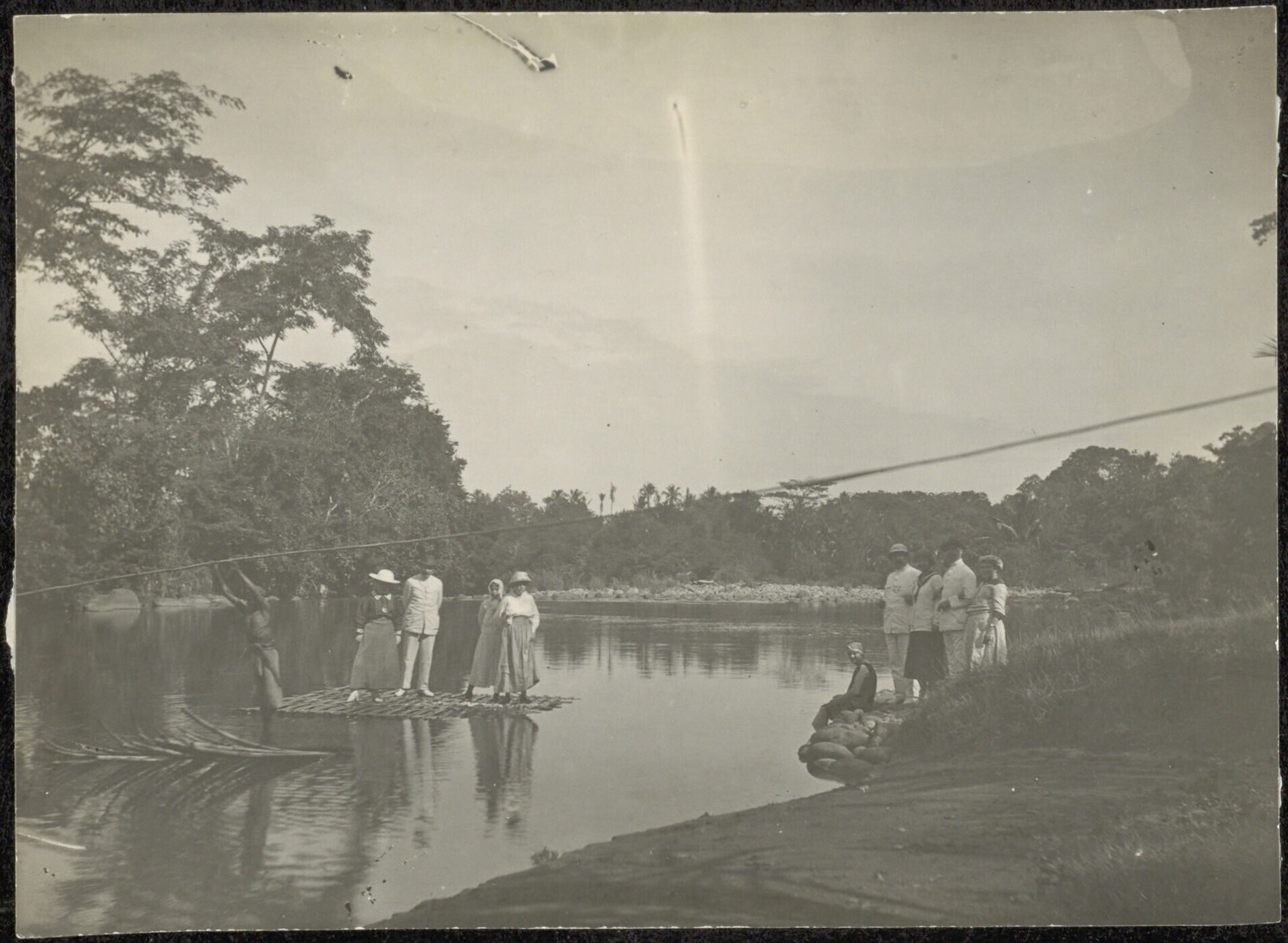 Mensen op een vlot op, en aan de oever van de Ci Berang