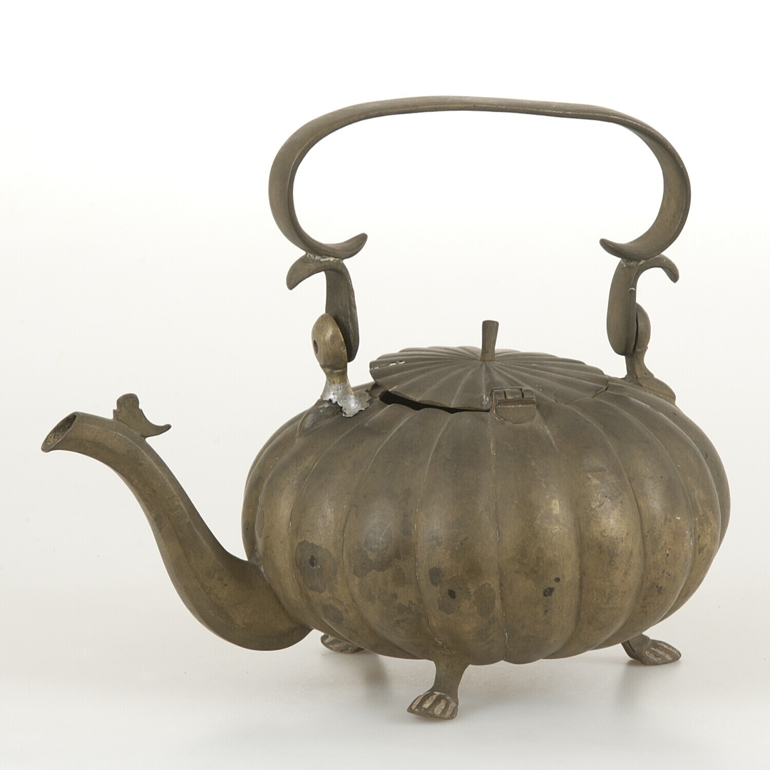 Bamboe opiumpijp met aardewerken kop en koperen plaat