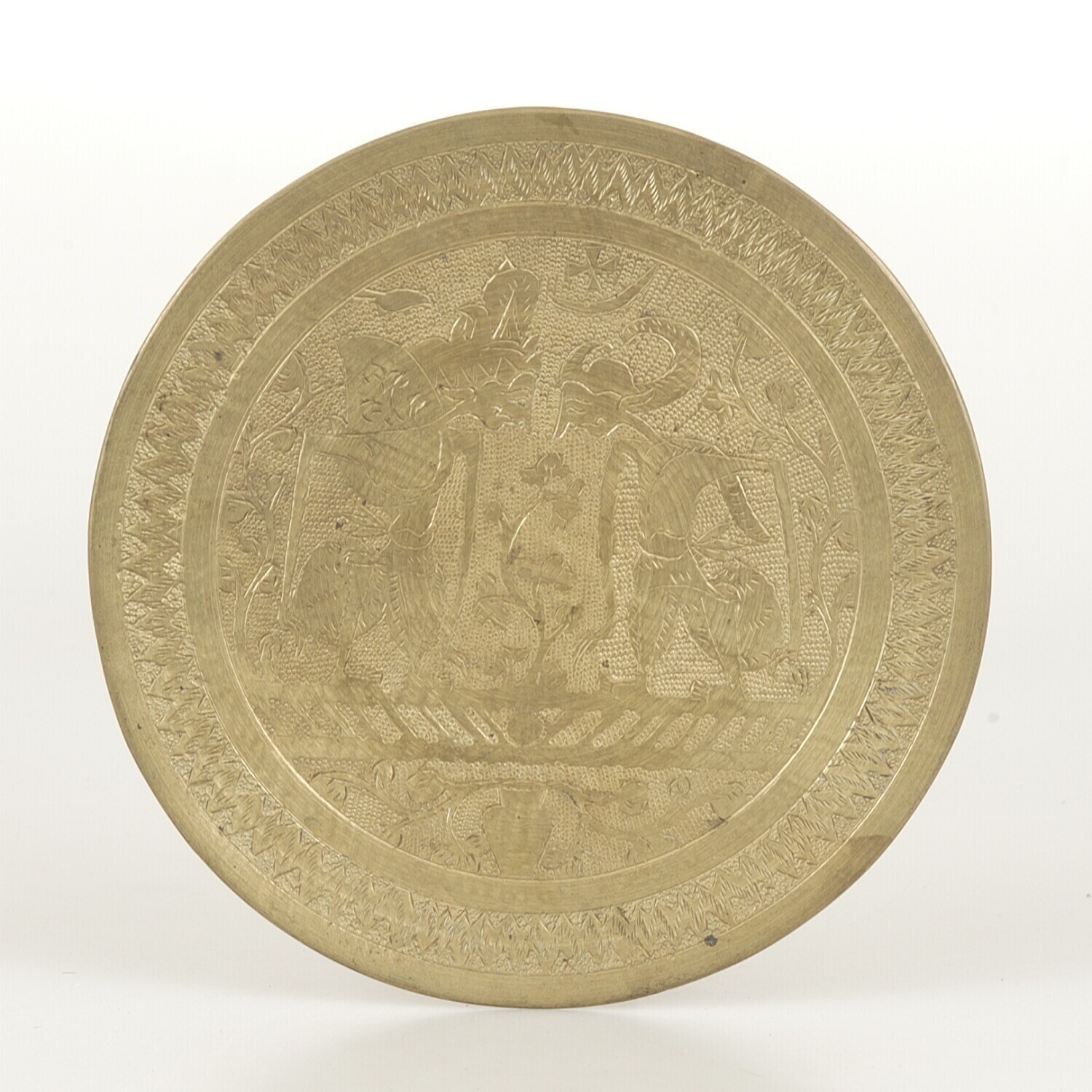 Ronde doos van geelkoper met een voorstelling van Ar...