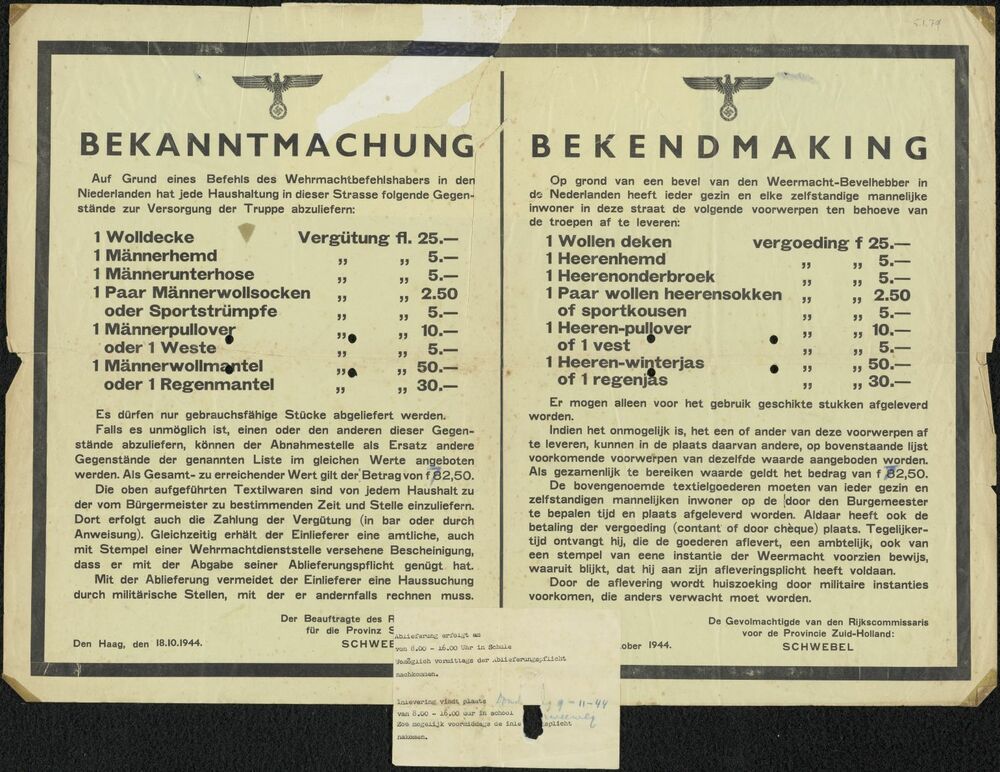 poster; Duitse bekendmaking Vordering Heren kledings...