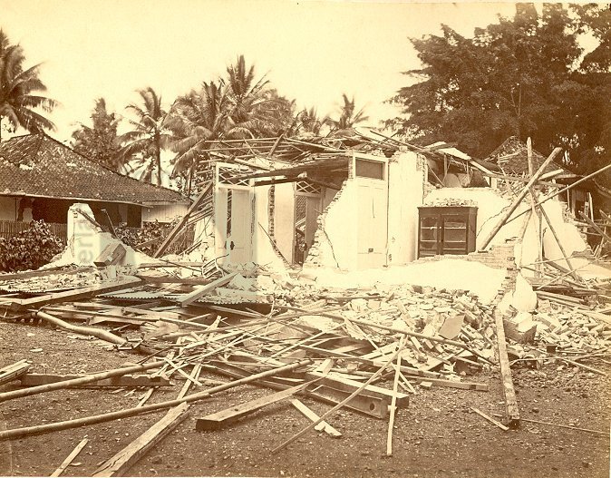 Verwoeste huizen na de aardbeving van 1878, Java, In...