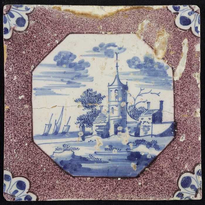 Tafereeltegel, gebouwen met zeilschepen, hoekmotief ...
