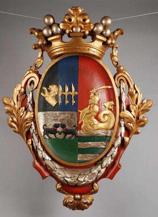 Houten gepolychromeerd wapenschild met kroon en in o...