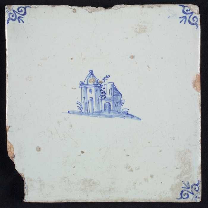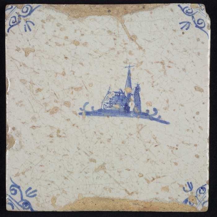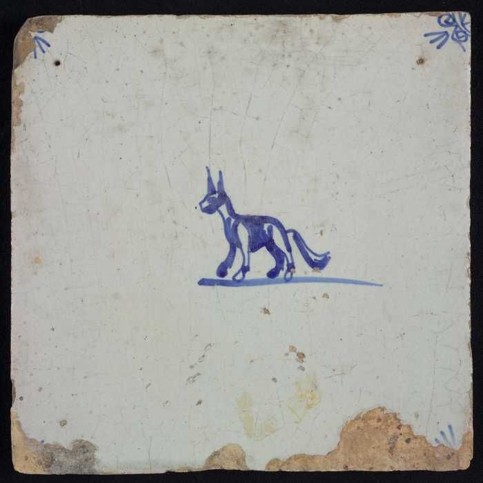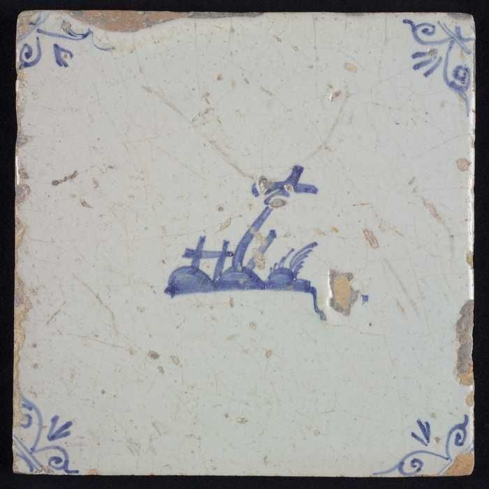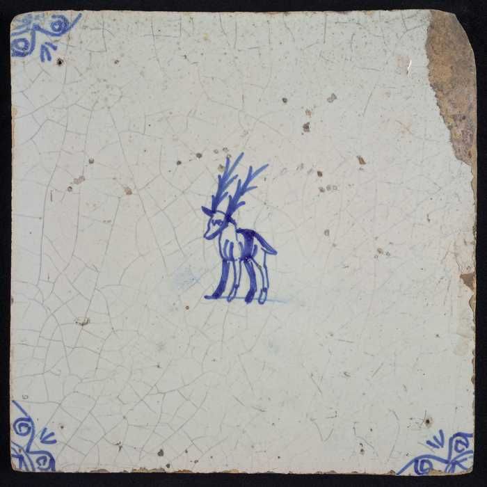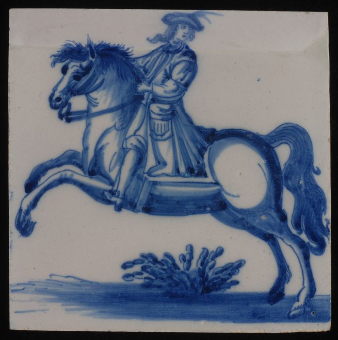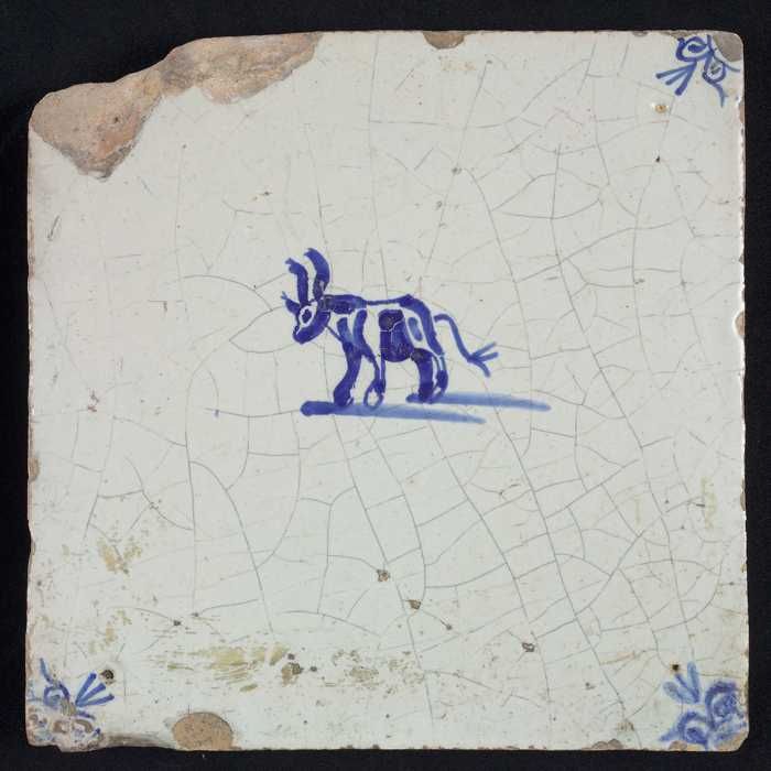 Tegel, blauw op wit, met de afbeelding van een neers...