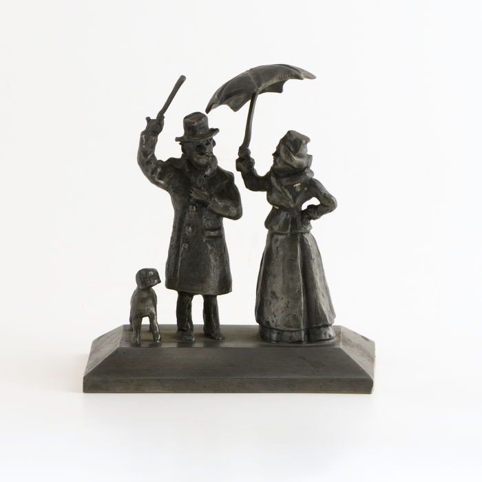 Beeldje van vrouw, man en hond, beeldmerk van de RVS