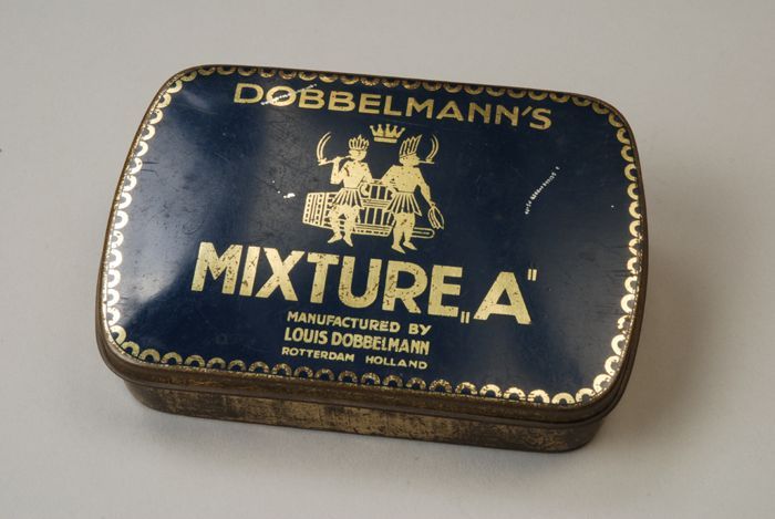 Rechthoekig tabaksblik met scharnierend deksel, blau...