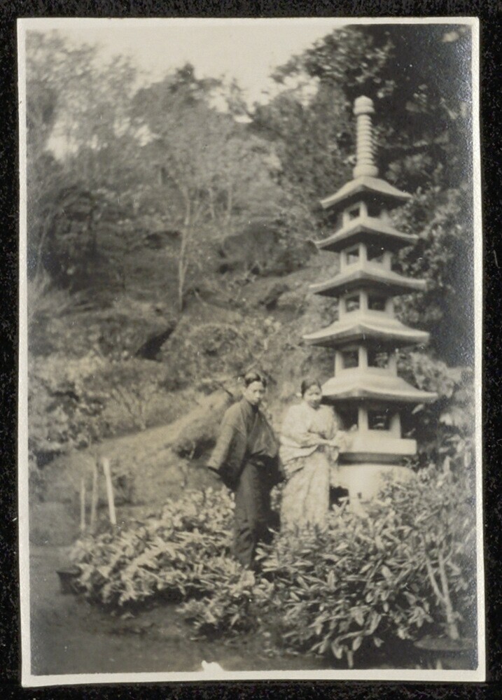 Roekmita en Pandoe Soeradhiningrat in een tuin