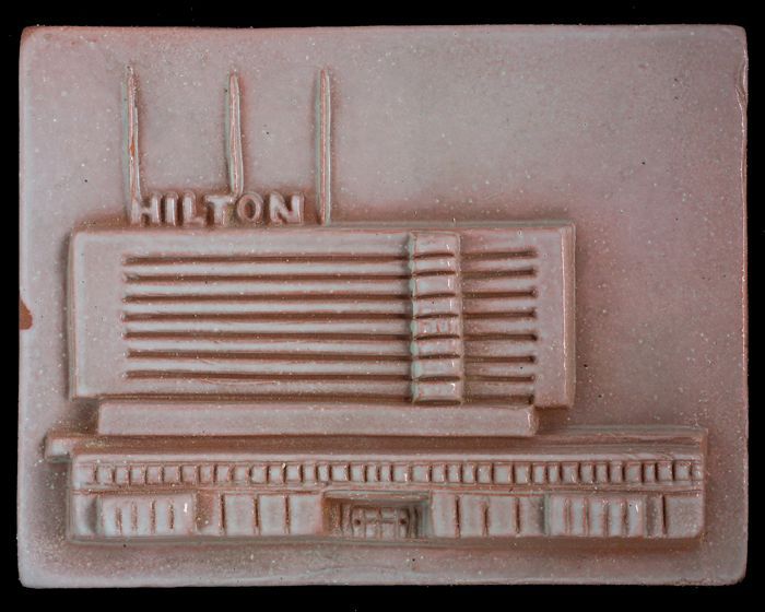 Rechthoekige tegel met in reliëf het Hilton hotel, R...
