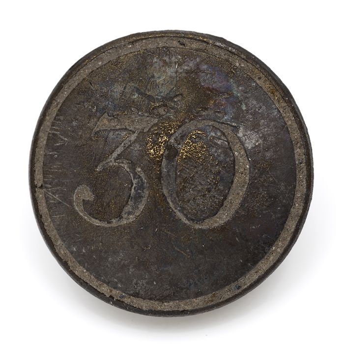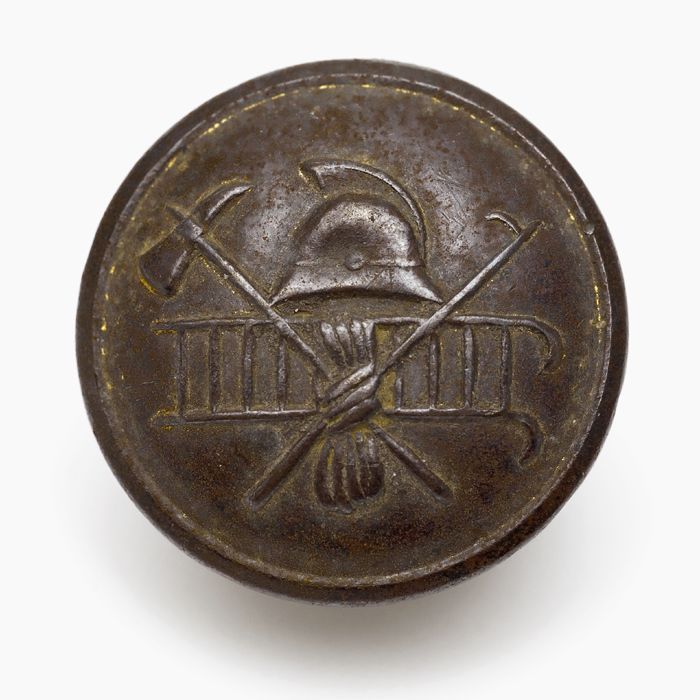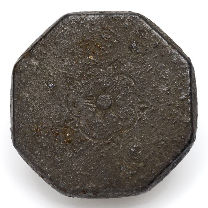 Metalen knoop met roos in reliëf op de kop, vast oog