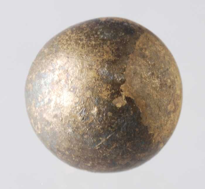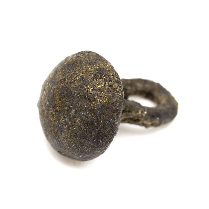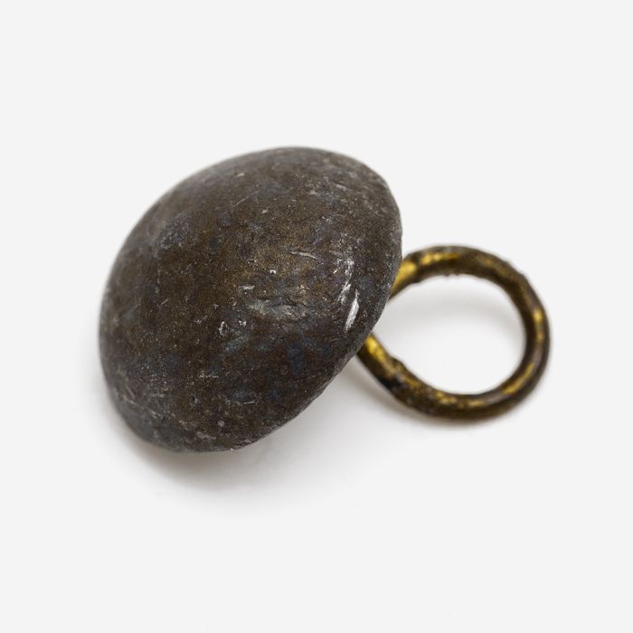 Metalen knoop met vast oog, in reliëf een bloemfiguur
